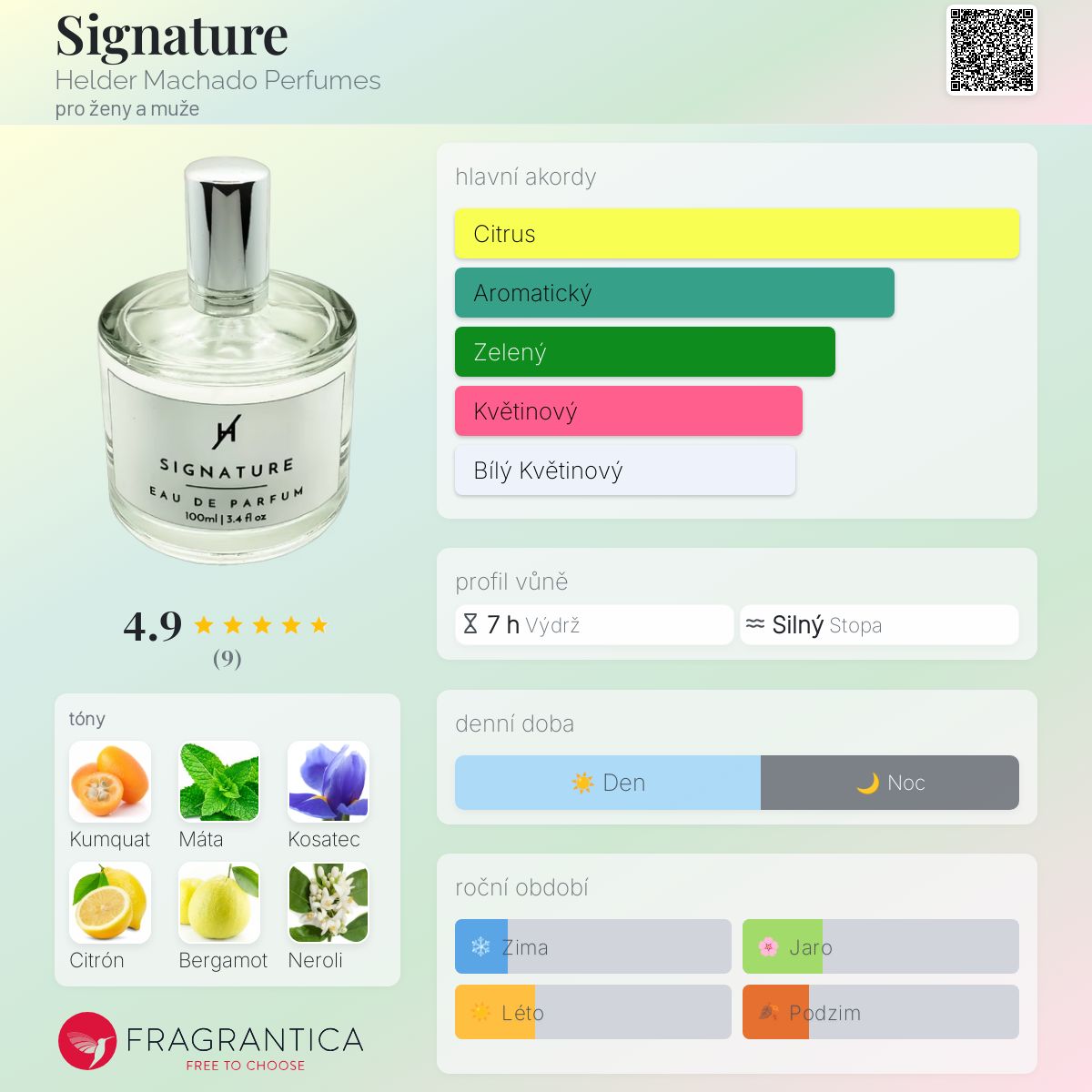 Signature podle Helder Machado Perfumes je Citrus Aromatic vůně pro ženy a muže. Signature byl/a uveden/a v roce 2020. Vrchní tóny jsou Kumquat, Sicilský citron, Bergamot, Neroli a Mandarinka; střední tóny jsouMáta, Pomerančový květ, Petitgrain, Pivoňka a Frézie ; základní tóny jsou Kosatec, Vetiver, Pižmo, Jantar (ambra) a Pačuli.
