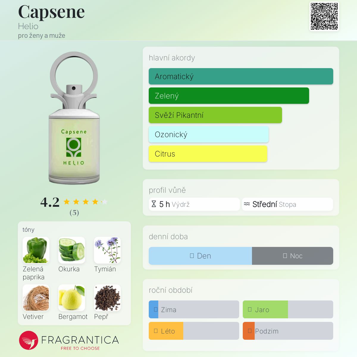 Capsene podle Helio je Aromatic Green vůně pro ženy a muže. Capsene byl/a uveden/a v roce 2019. "Nosem" za touto vůní je Ralf Schwieger.