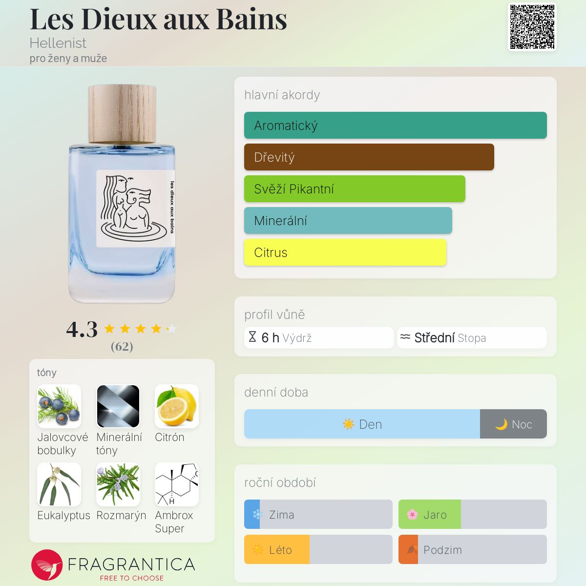 Les Dieux aux Bains podle Hellenist je Aromatic Aquatic vůně pro ženy a muže. Toto je nová vůně. Les Dieux aux Bains byl/a uveden/a v roce 2025. "Nosem" za touto vůní je Pierre-Constantin Guéros. Vrchní tóny jsou Jalovcové bobulky, Citrón, Eukalyptus a Rozmarýn; střední tón jeMinerální tóny ; základní tóny jsou Ambrox Super a Mech.
