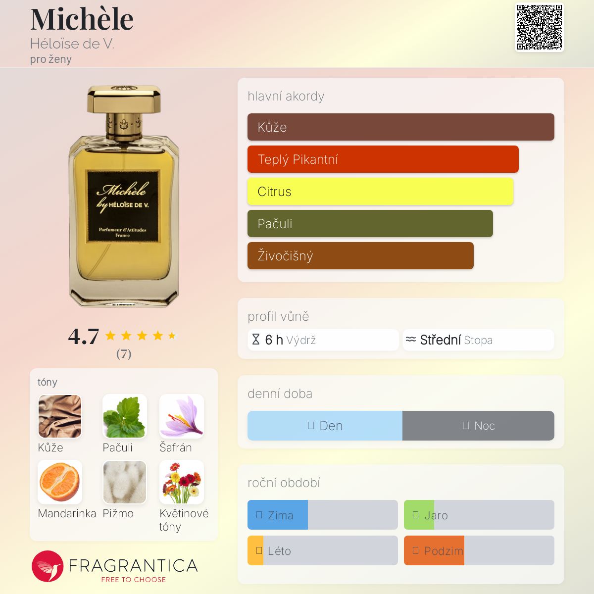 Michèle podle Héloïse de V. je Orientální Floral vůně pro ženy. Michèle byl/a uveden/a v roce 2017. "Nosem" za touto vůní je Melanie Leroux. Vrchní tóny jsou Šafrán, Mandarinka a Pomeranč; střední tón jeKvětinové tóny ; základní tóny jsou Kůže, Pačuli, Bílé pižmo a Jantar (ambra).