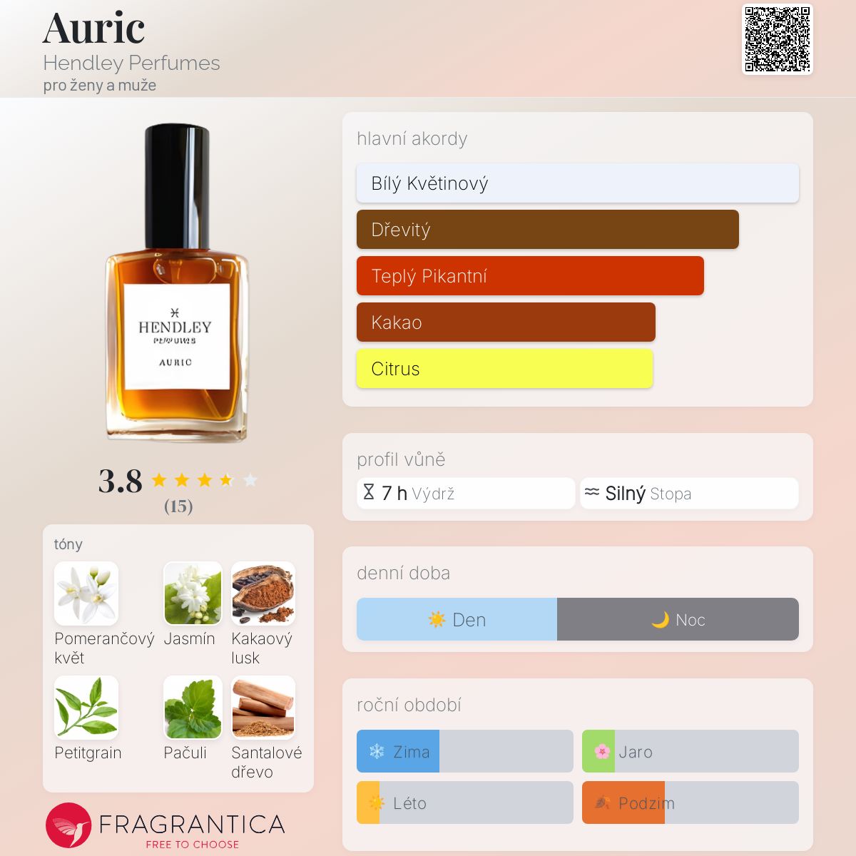 Auric podle Hendley Perfumes je Orientální Floral vůně pro ženy a muže. Auric byl/a uveden/a v roce 2014. "Nosem" za touto vůní je Hans Hendley.
