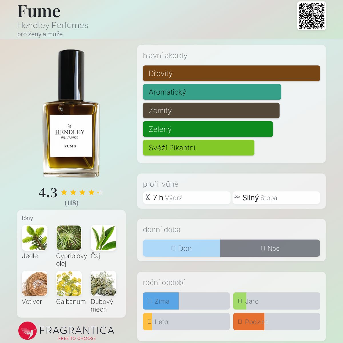 Fume podle Hendley Perfumes je Woody Chypre vůně pro ženy a muže. Fume byl/a uveden/a v roce 2015. "Nosem" za touto vůní je Hans Hendley.