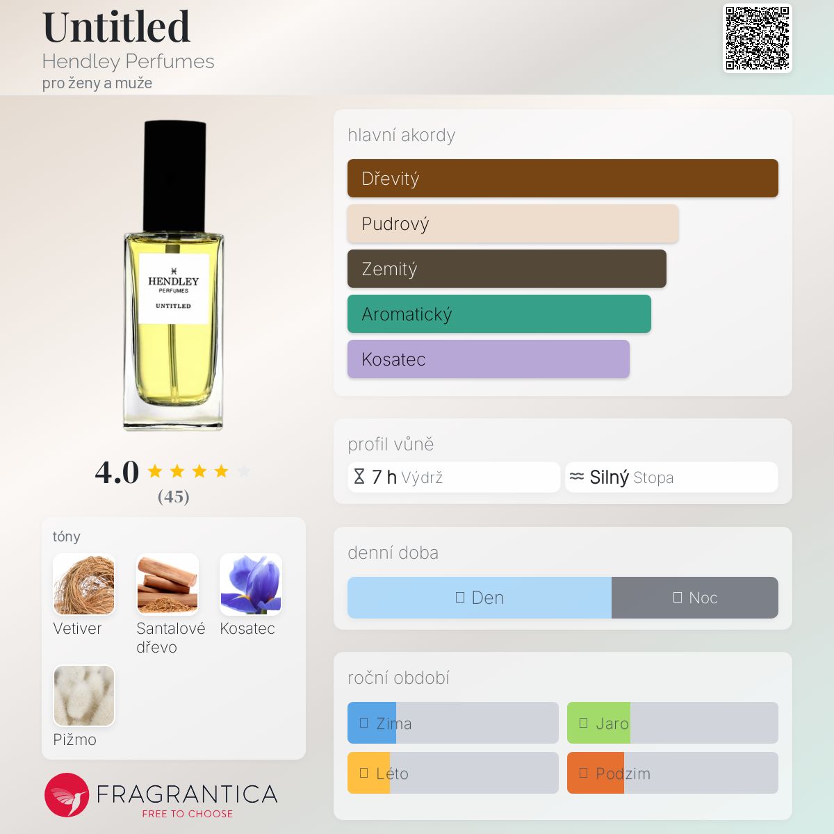 Untitled podle Hendley Perfumes je Woody Floral Musk vůně pro ženy a muže. Untitled byl/a uveden/a v roce 2019. "Nosem" za touto vůní je Hans Hendley.