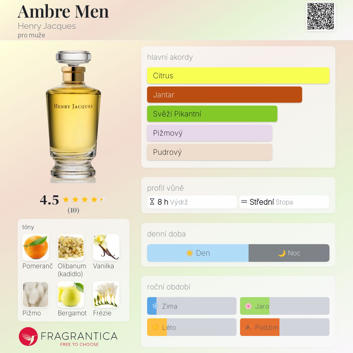 Ambre Men podle Henry Jacques je Orientální Woody vůně pro muže. Vrchní tóny jsou Sladký pomeranč, Bergamot a Frézie; střední tóny jsouOlibanum, Pačuli a Toskánský kosatec ; základní tóny jsou Vanilka, Bílé pižmo a Labdanum.