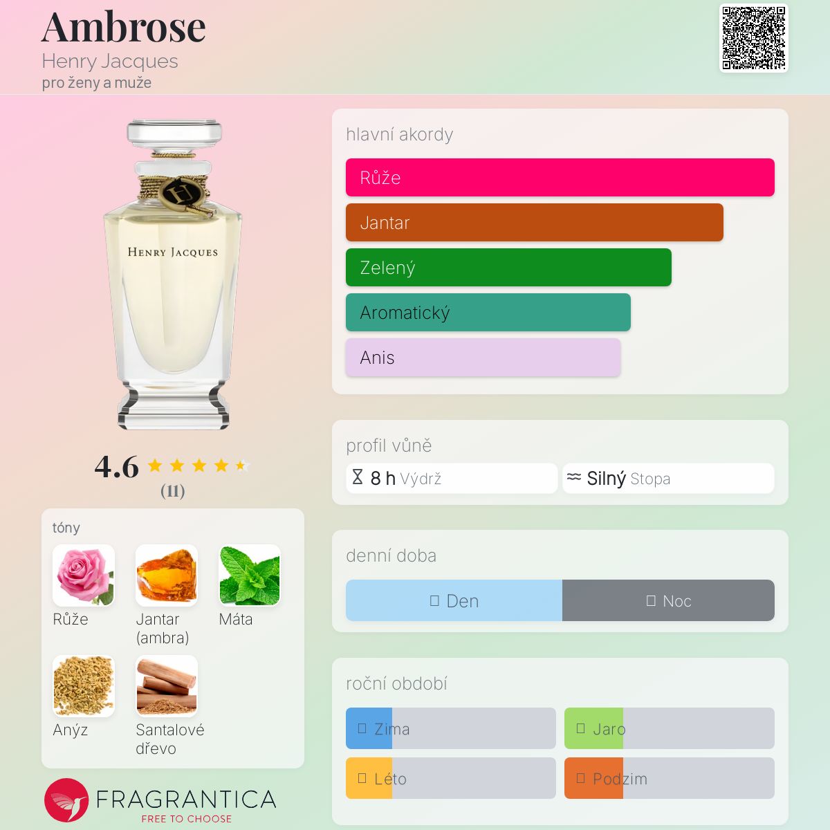 Ambrose podle Henry Jacques je Floral Green vůně pro ženy a muže. Vrchní tóny jsou Růže a Máta; střední tón jeAnýz ; základní tóny jsou Jantar (ambra) a Santalové dřevo.