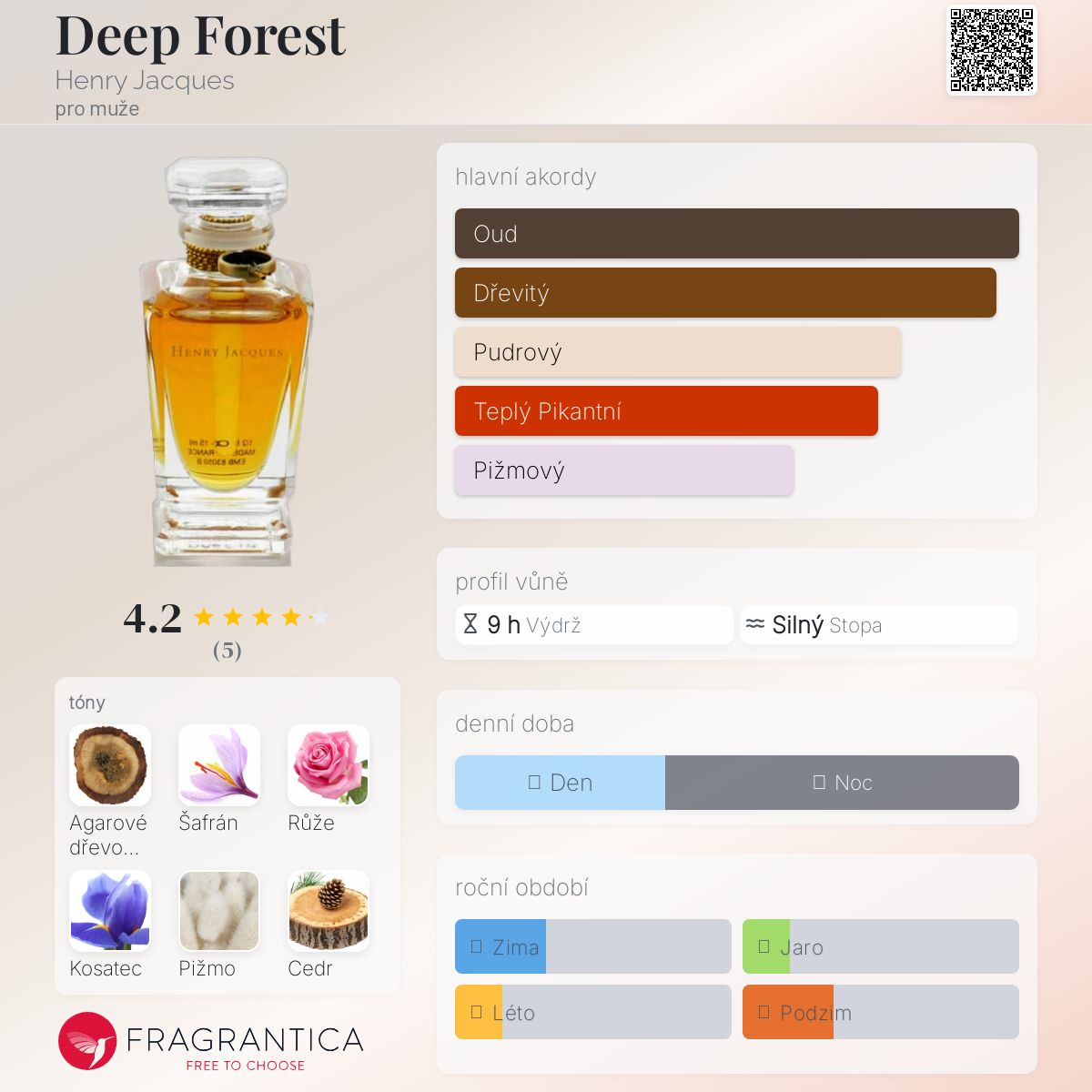Deep Forest podle Henry Jacques je Orientální Woody vůně pro muže. Vrchní tóny jsou Šafrán, Damašská růže a Kosatec; střední tóny jsouAgarové dřevo (oud), Bílé pižmo a Cedr ; základní tóny jsou Santalové dřevo, Pačuli a Jantar (ambra).