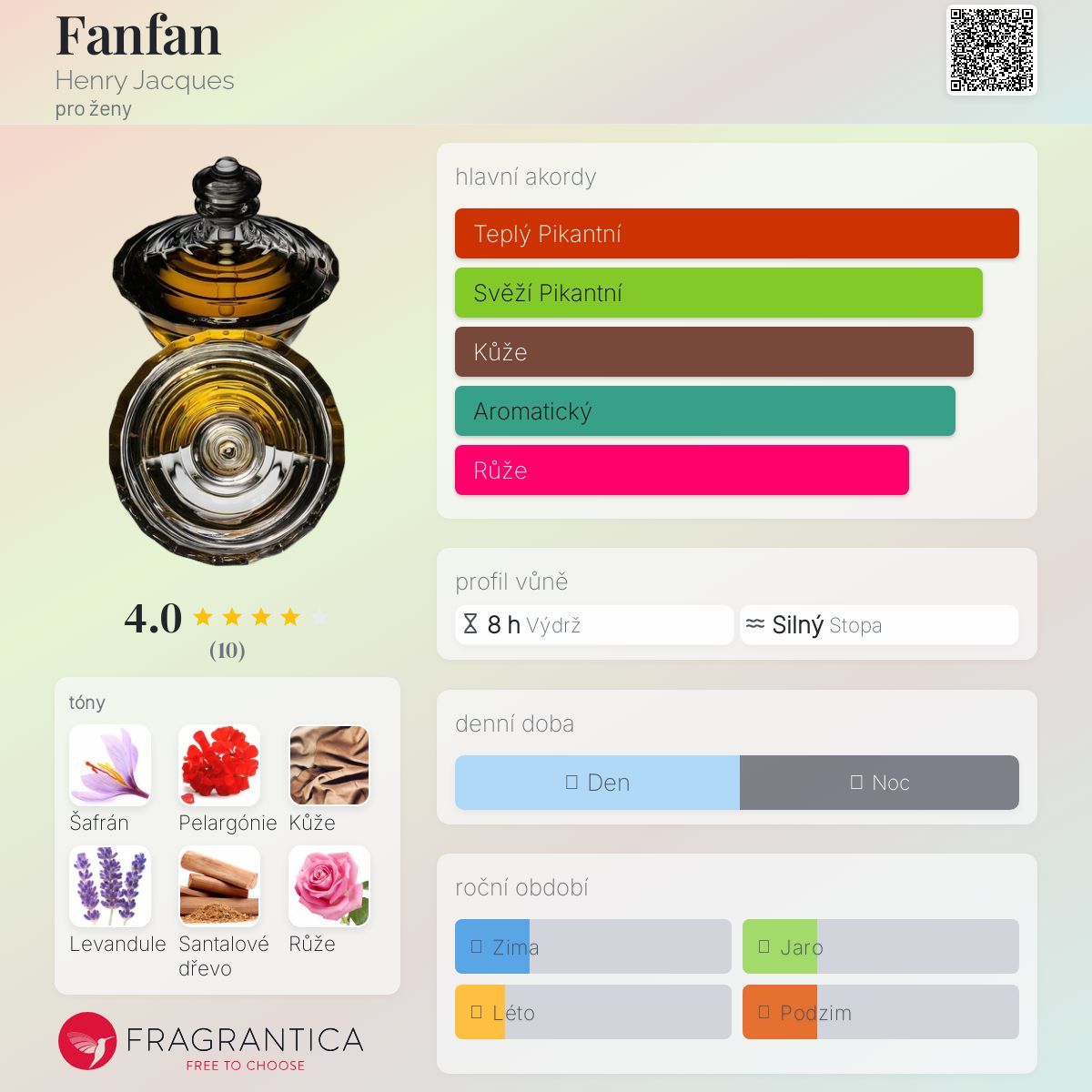 Fanfan podle Henry Jacques je Aromatic vůně pro ženy. Fanfan byl/a uveden/a v roce 2019. Fanfan byl/a vytvořen/a Henry Jacques a Christophe Tollemer. Vrchní tóny jsou Šafrán, Pelargónie a Levandule; střední tóny jsouSantalové dřevo a Damašská růže ; základní tóny jsou Kůže, Cedr a Jantar (ambra).