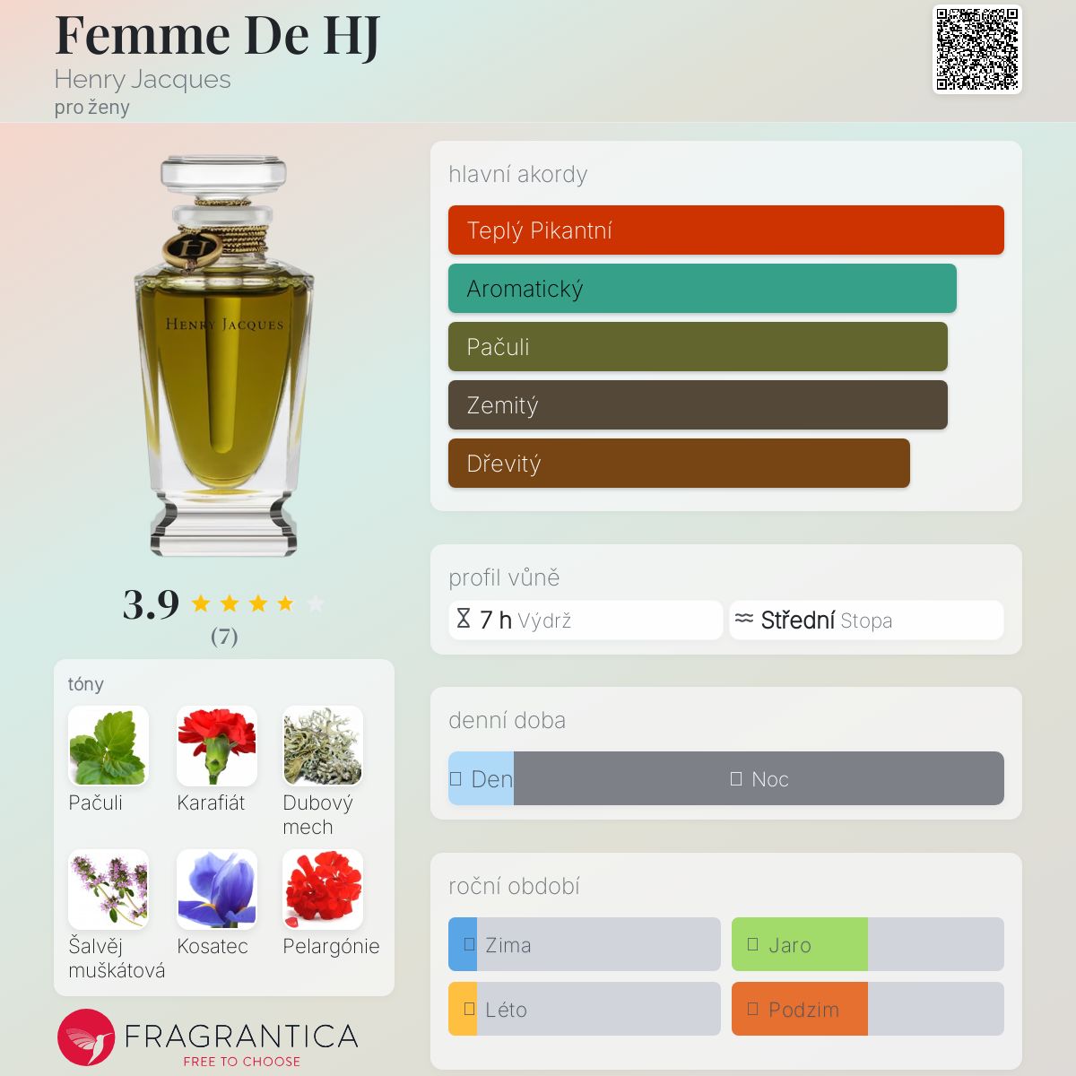 Femme De HJ podle Henry Jacques je Chypre Floral vůně pro ženy. Femme De HJ byl/a uveden/a v roce 2010. Vrchní tóny jsou Šalvěj muškátová, Kosatec a Pelargónie; střední tóny jsouKarafiát, Růže a Jasmín ; základní tóny jsou Pačuli, Dubový mech a Pižmo.