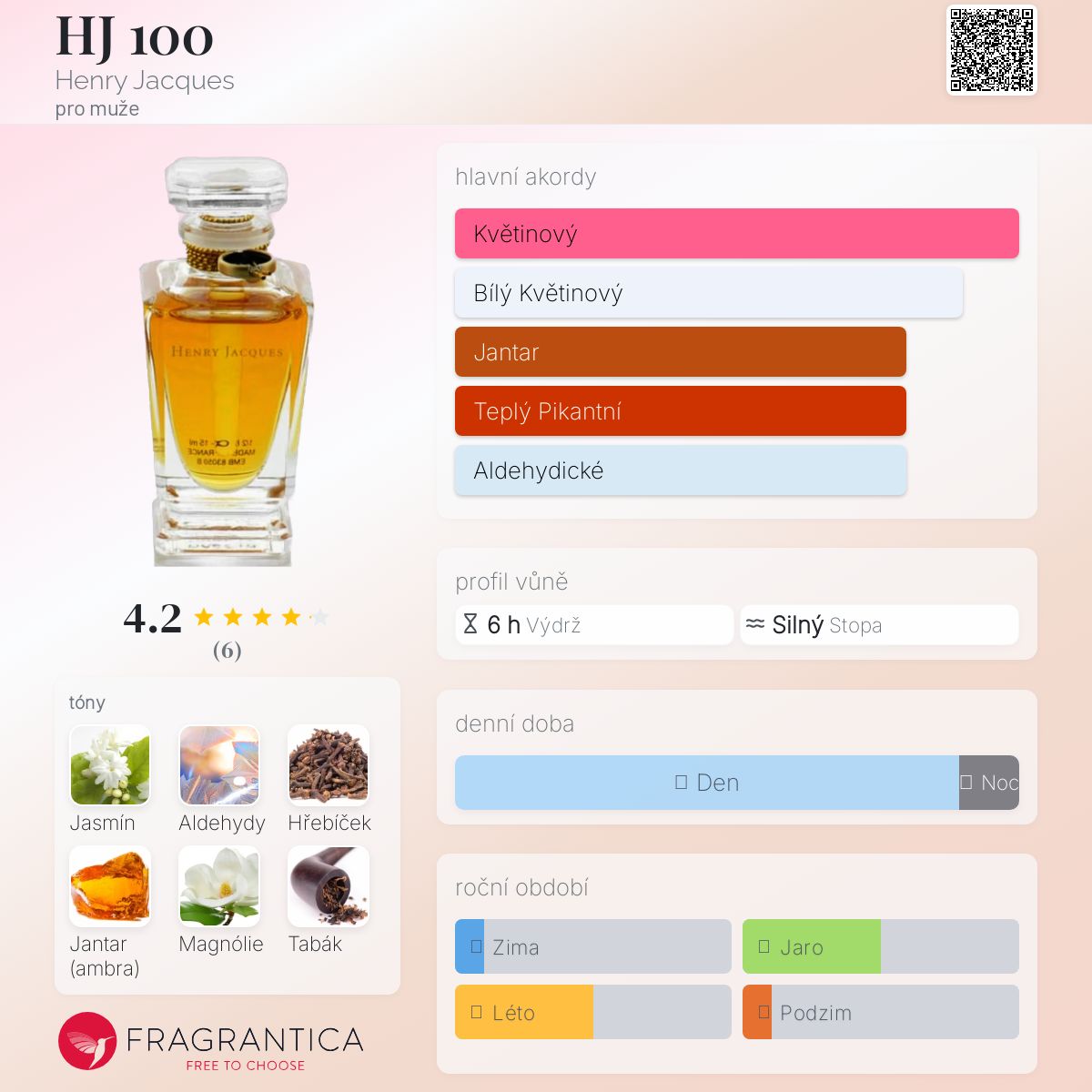 HJ 100 podle Henry Jacques je Floral Aldehyde vůně pro muže. HJ 100 byl/a uveden/a v roce 2016. Vrchní tóny jsou Aldehydy, Citrusy a Frézie; střední tóny jsouJasmín, Hřebíček a Magnólie ; základní tóny jsou Jantar (ambra), Tabák a Bílé pižmo.