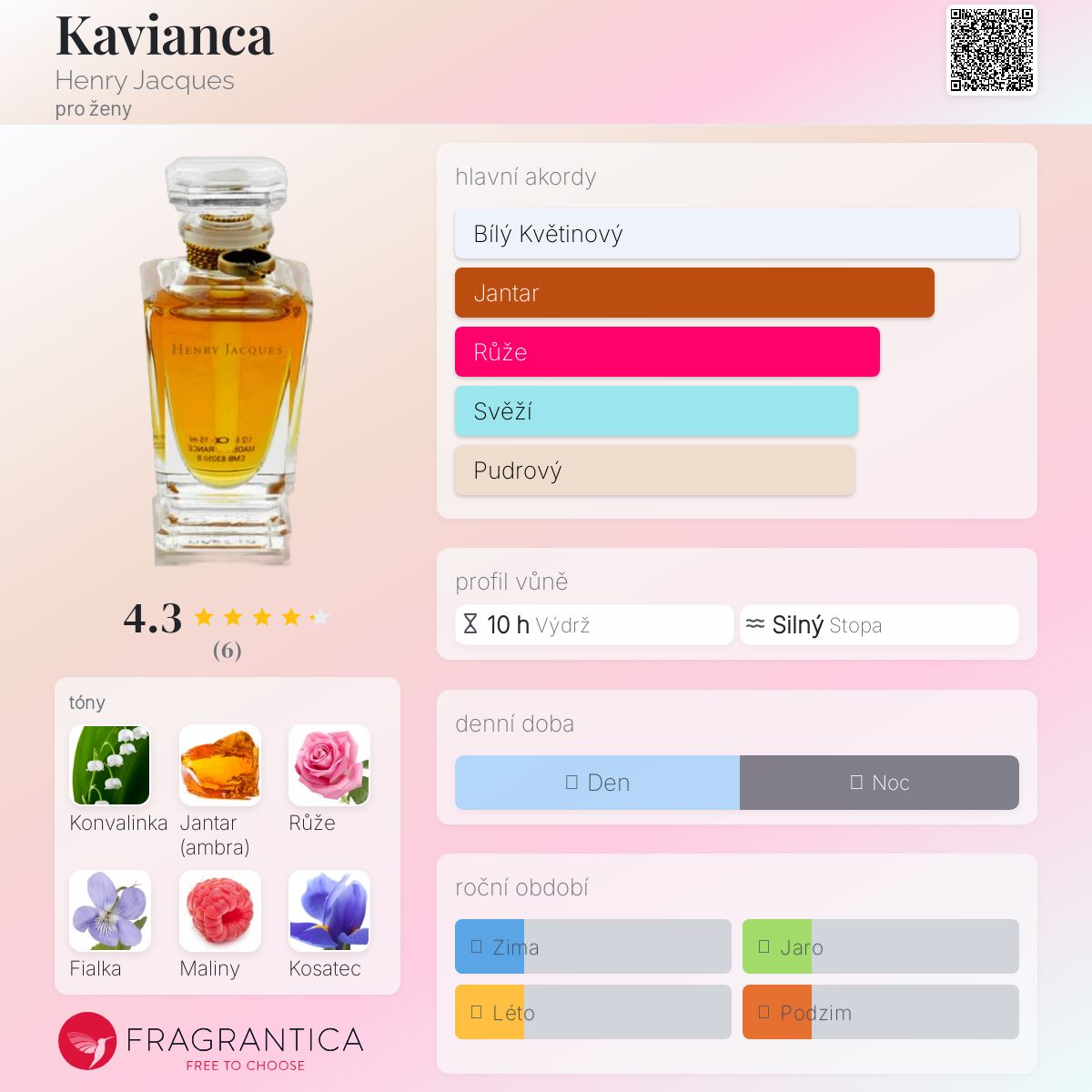 Kavianca podle Henry Jacques je Floral vůně pro ženy. Vrchní tóny jsou Konvalinka, Fialka a Maliny; střední tóny jsouRůže, Kosatec a Jasmín ; základní tóny jsou Jantar (ambra) a Vanilka.