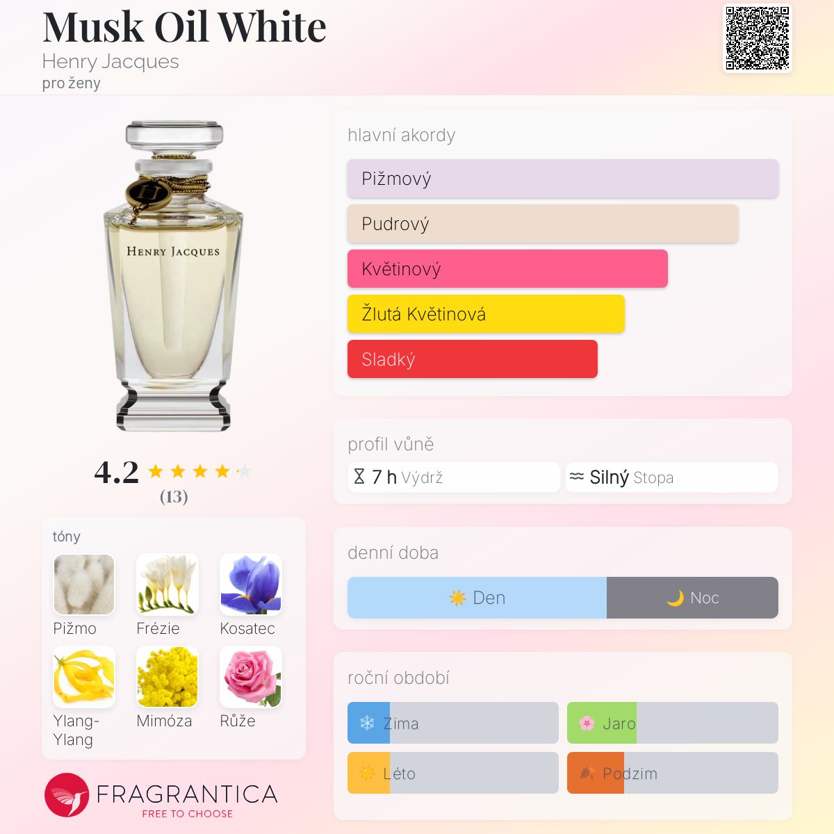 Musk Oil White podle Henry Jacques je Floral vůně pro ženy. Musk Oil White byl/a uveden/a v roce 2010. Vrchní tóny jsou Frézie, Kosatec a Ylang-Ylang; střední tóny jsouMimóza, Damašská růže a Jasmín ; základní tóny jsou Bílé pižmo a Bourbonská vanilka.