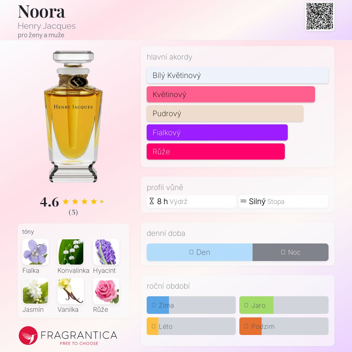 Noora podle Henry Jacques je vůně pro ženy a muže. Vrchní tóny jsou Fialka, Konvalinka a Maliny; střední tóny jsouHyacint, Jasmín a Růže ; základní tóny jsou Vanilka, Jantar (ambra) a Pižmo.