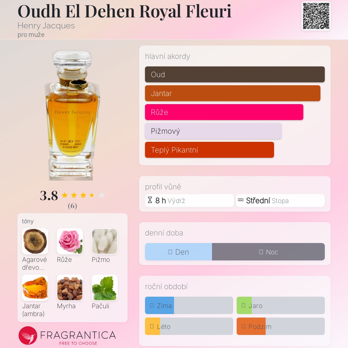 Oudh El Dehen Royal Fleuri podle Henry Jacques je Woody Floral Musk vůně pro muže. Vrchní tóny jsou Šafrán a Janovec; střední tóny jsouAgarové dřevo (oud), Myrha a Pačuli ; základní tóny jsou Damašská růže, Bílé pižmo a Jantar (ambra).