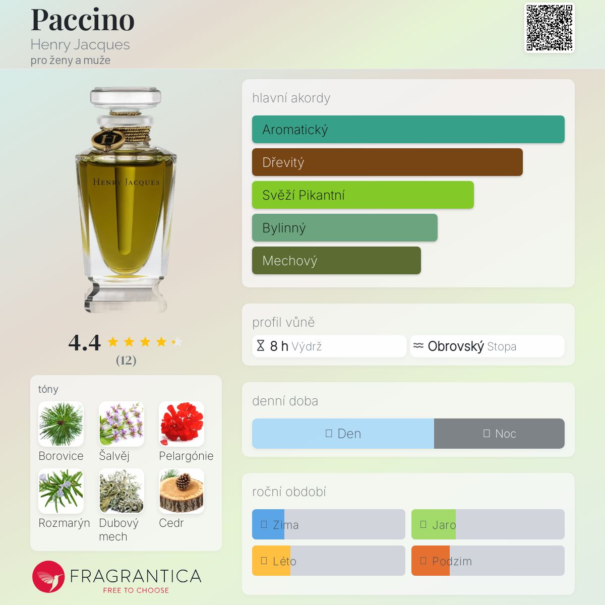 Paccino podle Henry Jacques je Floral Woody Musk vůně pro ženy a muže. Toto je nová vůně. Paccino byl/a uveden/a v roce 2024. Vrchní tóny jsou Borovice, Šalvěj a Rozmarýn; střední tóny jsouPelargónie a Neroli ; základní tóny jsou Dubový mech, Cedr a Pižmo.