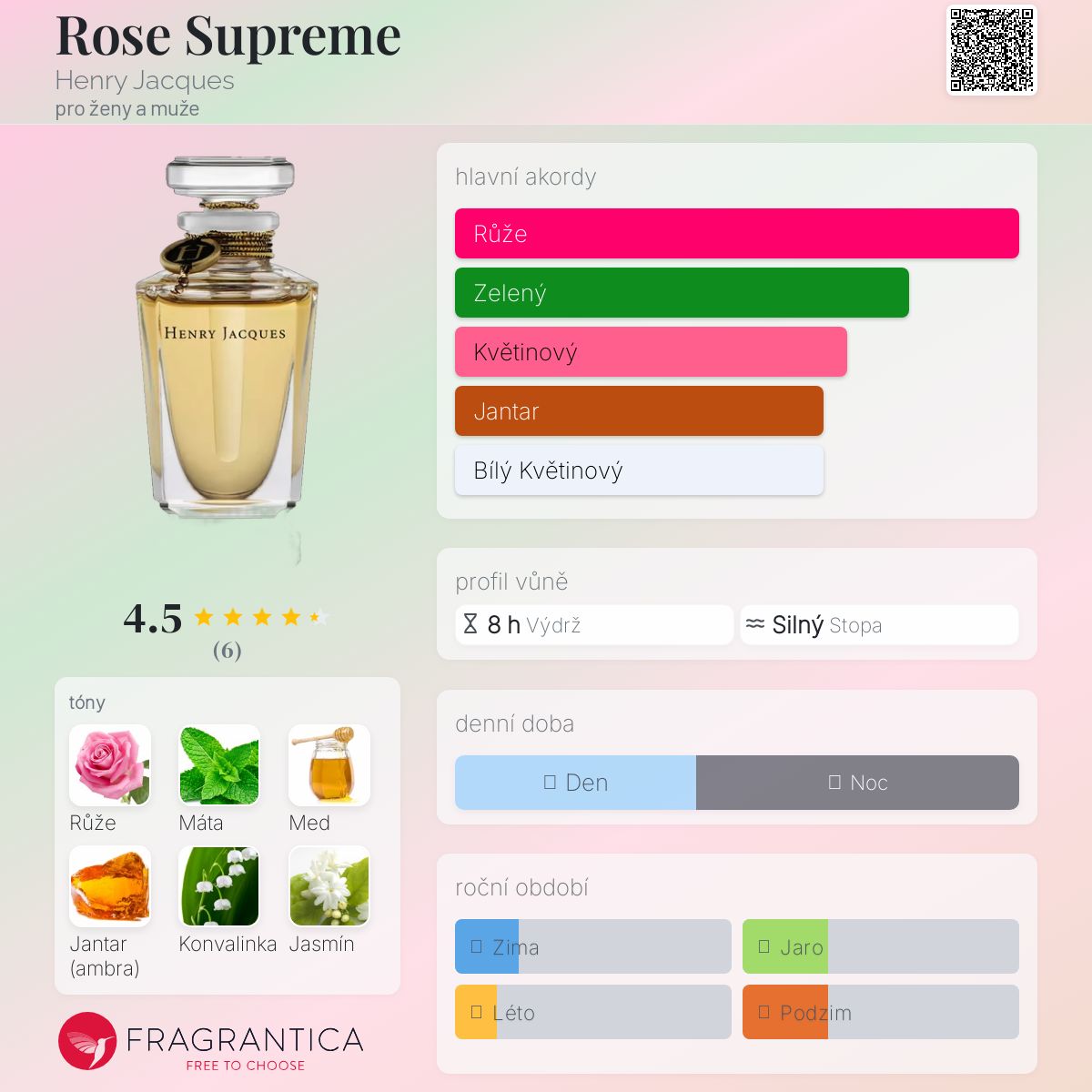 Rose Supreme podle Henry Jacques je Floral vůně pro ženy a muže. Rose Supreme byl/a uveden/a v roce 2020. Vrchní tóny jsou Damašská růže a Konvalinka; střední tóny jsouMáta a Jasmín ; základní tóny jsou Med, Jantar (ambra) a Santalové dřevo.
