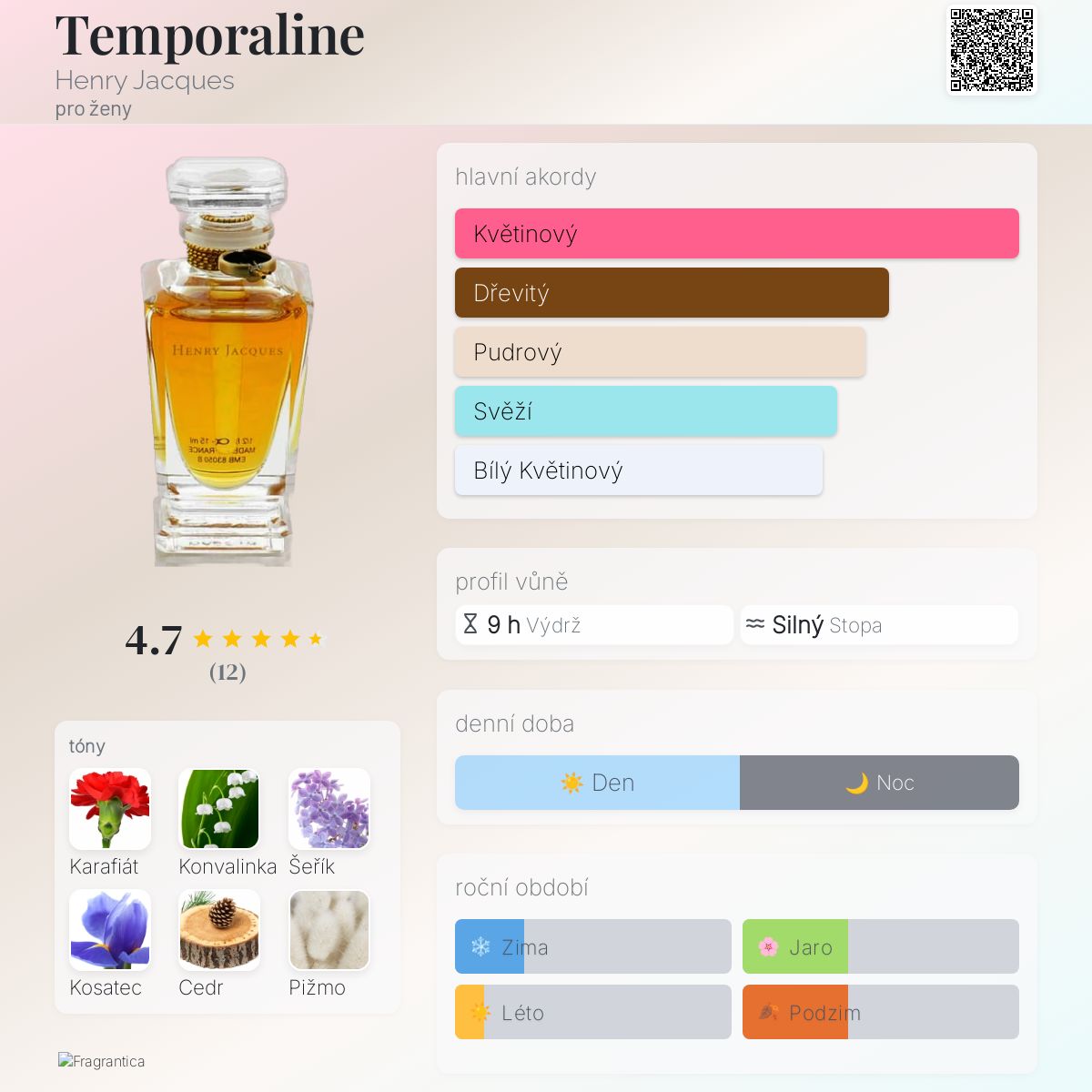 Temporaline podle Henry Jacques je Floral vůně pro ženy. Temporaline byl/a uveden/a v roce 2010. Vrchní tóny jsou Ylang-Ylang a Růže; střední tóny jsouKarafiát, Konvalinka a Šeřík ; základní tóny jsou Kosatec, Cedr a Bílé pižmo.