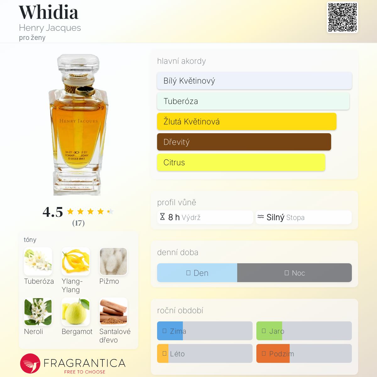 Whidia podle Henry Jacques je Floral Woody Musk vůně pro ženy. Whidia byl/a uveden/a v roce 2010. Vrchní tóny jsou Neroli, Bergamot a Mandarinka; střední tóny jsouYlang-Ylang, Růže a Cedr ; základní tóny jsou Tuberóza, Bílé pižmo a Santalové dřevo.