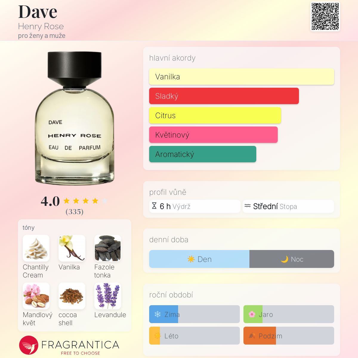 Dave podle Henry Rose je Orientální Vanilla vůně pro ženy a muže. Toto je nová vůně. Dave byl/a uveden/a v roce 2025. "Nosem" za touto vůní je Pascal Gaurin. Vrchní tóny jsou Neroli, Růžový pepř a Mandarinka; střední tóny jsouMandlový květ , Levandulový extrakt a Pomeranč ; základní tóny jsou Šlehačka Chantilly, Vanilkový lusk, Fazole tonka a Kakaová slupka.