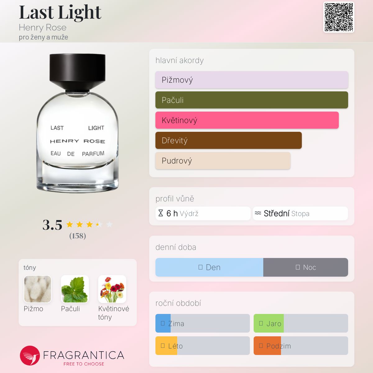 Last Light podle Henry Rose je Floral Woody Musk vůně pro ženy a muže. Last Light byl/a uveden/a v roce 2019. Last Light byl/a vytvořen/a Pascal Gaurin a Yves Cassar.