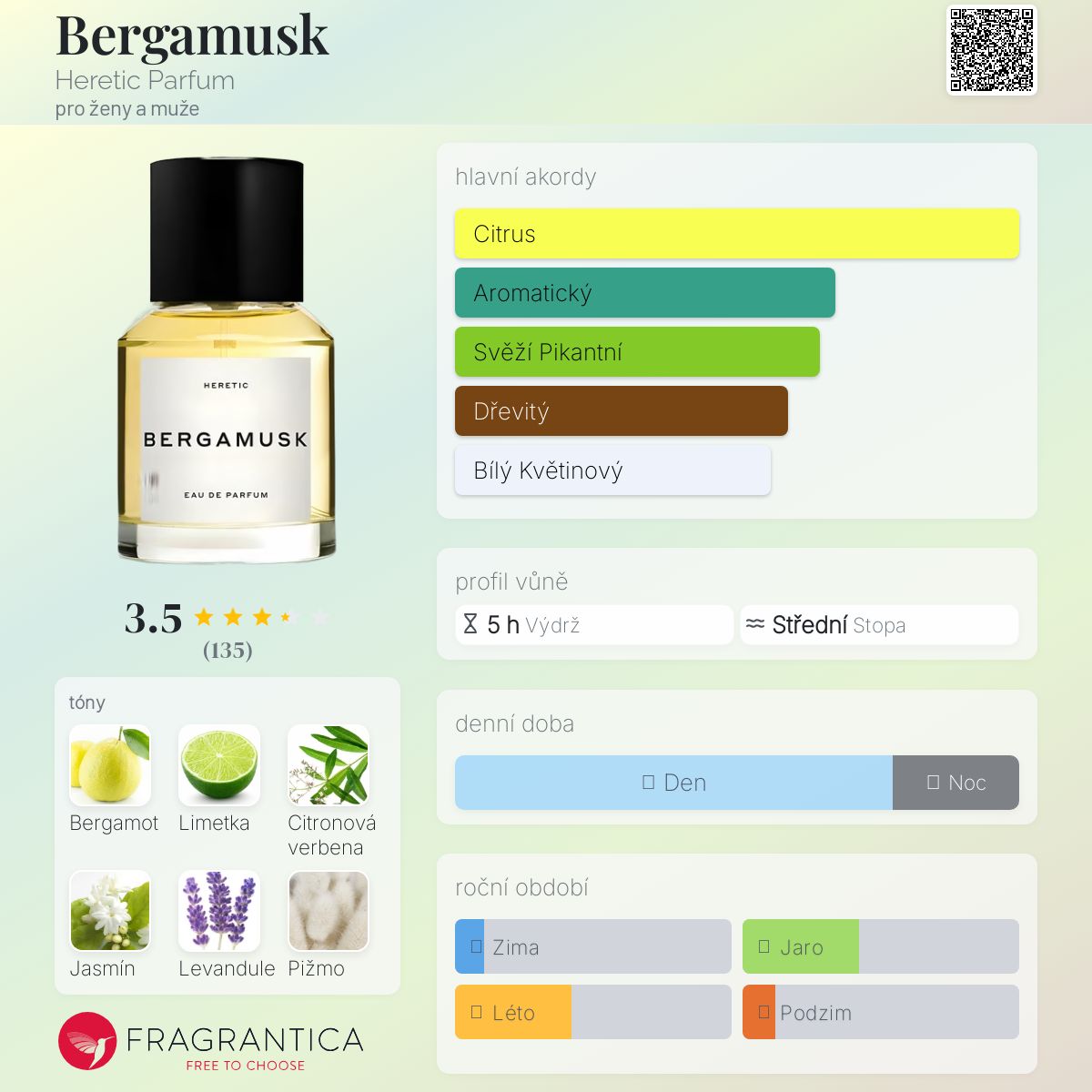 Bergamusk podle Heretic Parfum je Orientální Woody vůně pro ženy a muže. Bergamusk byl/a uveden/a v roce 2021. "Nosem" za touto vůní je Douglas Little. Vrchní tóny jsou Bergamot, Limetka, Citronová verbena, Levandule a Tymián; střední tóny jsouJasmín a Cedr ; základní tóny jsou Pižmo, Santalové dřevo a Ambrettolide.