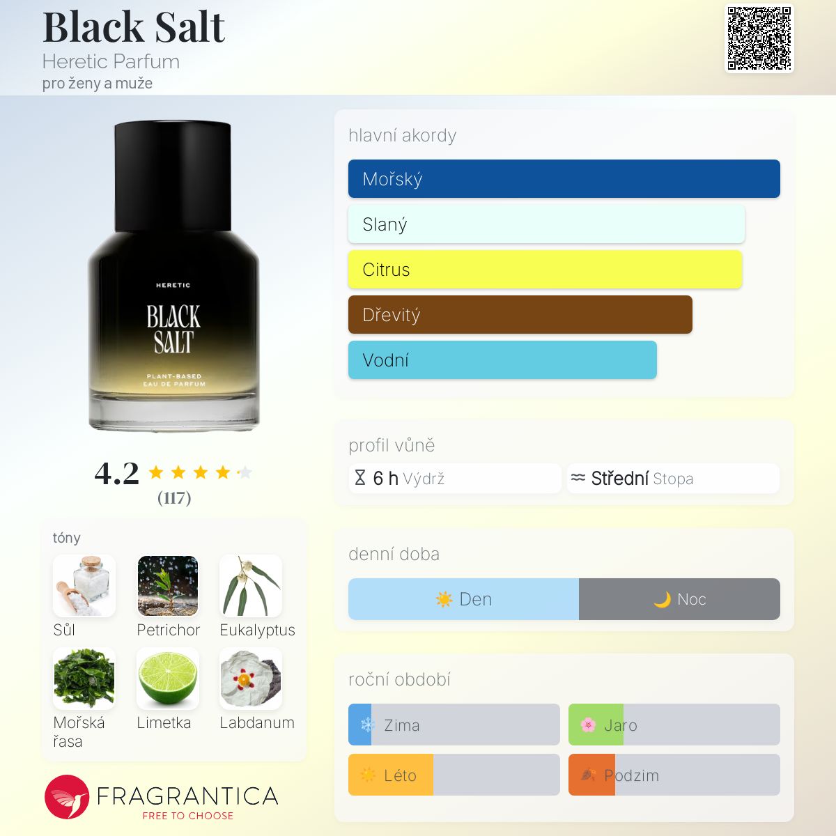 Black Salt podle Heretic Parfum je vůně pro ženy a muže. Toto je nová vůně. Black Salt byl/a uveden/a v roce 2025. Vrchní tóny jsou Eukalyptus, Limetka, Mandarinka a Černý pepř; střední tóny jsouMořská sůl, Turecká růže, Jasmín Sambac a Leknín ; základní tóny jsou Petrichor, Mořská řasa a Labdanum.