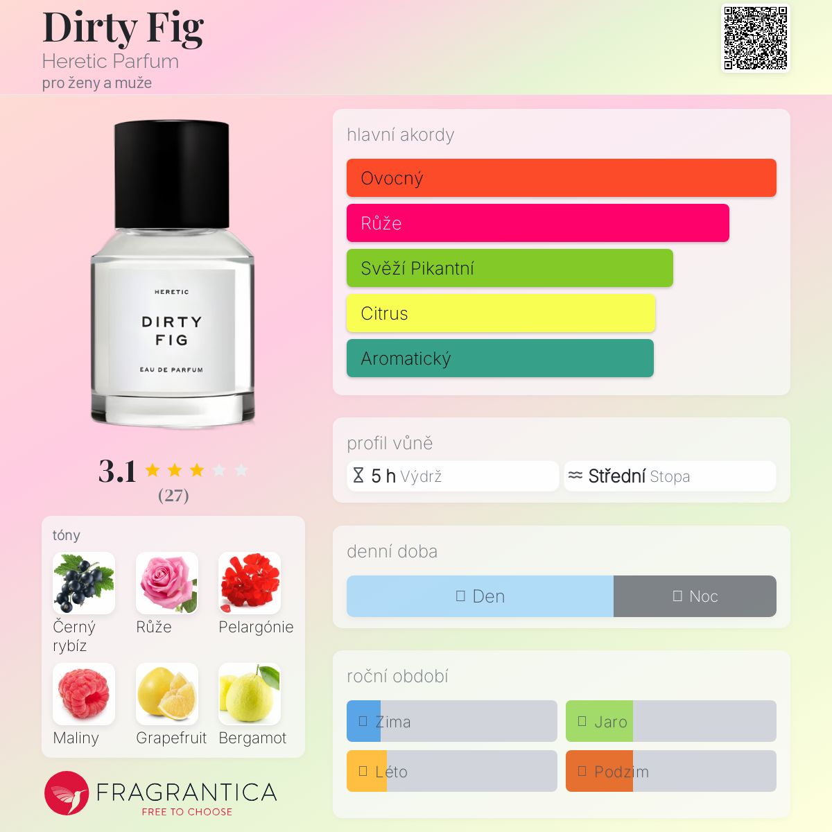 Dirty Fig podle Heretic Parfum je Floral Fruity vůně pro ženy a muže. Dirty Fig byl/a uveden/a v roce 2018. "Nosem" za touto vůní je Douglas Little. Vrchní tóny jsou Pelargónie, Grapefruit a Bergamot; střední tóny jsouČerný rybíz a Damašská růže ; základní tón je Maliny.