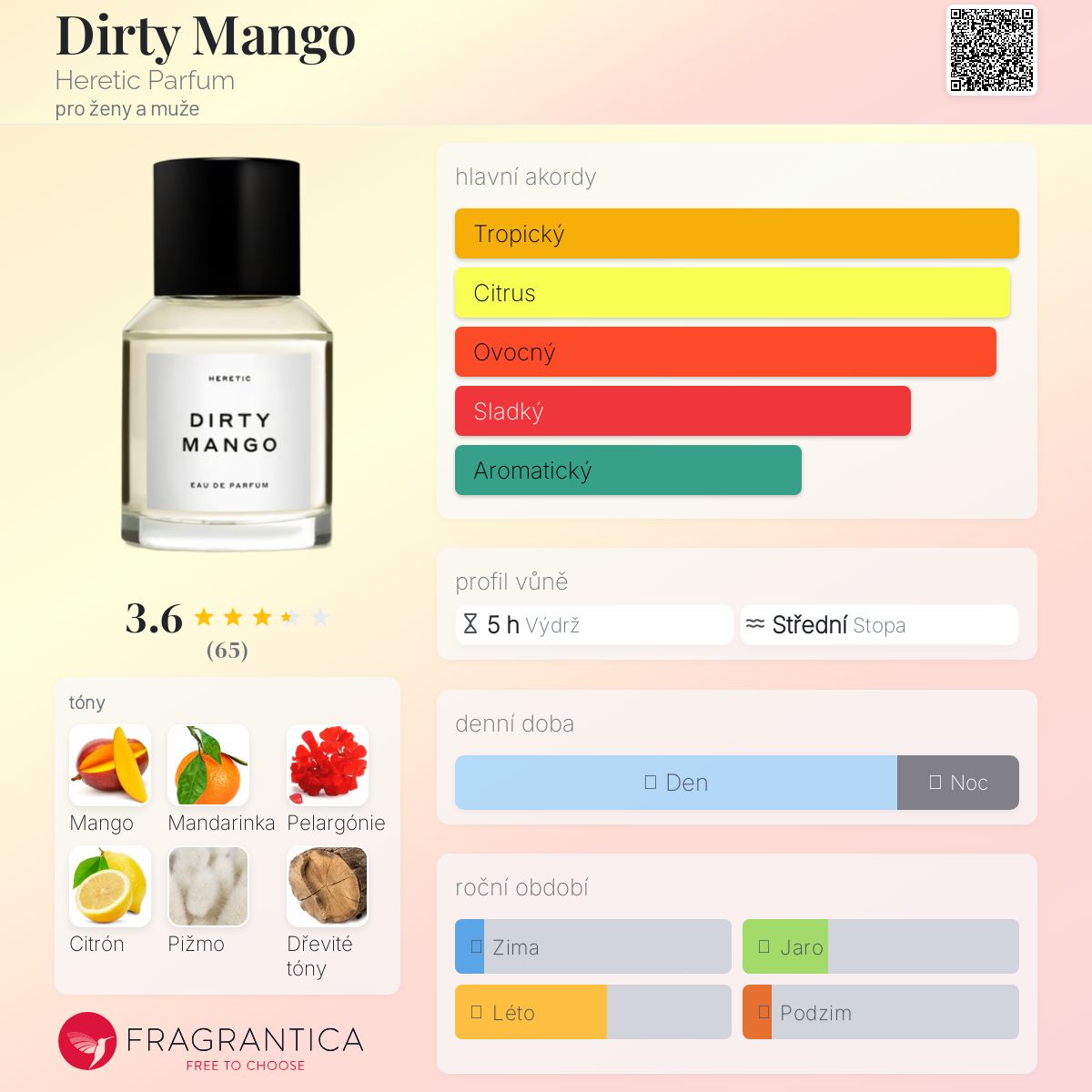 Dirty Mango podle Heretic Parfum je Citrus vůně pro ženy a muže. Dirty Mango byl/a uveden/a v roce 2020. "Nosem" za touto vůní je Douglas Little. Vrchní tóny jsou Mandarinka a Citrón; střední tóny jsouMango a Pelargónie ; základní tóny jsou Pižmo a Bílé dřevo.