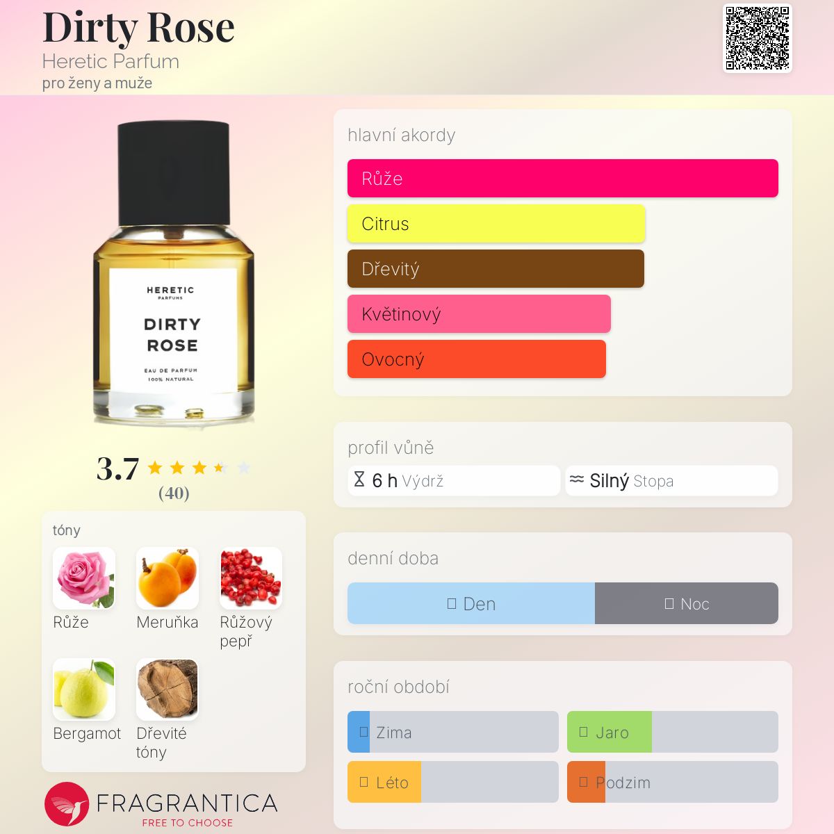 Dirty Rose podle Heretic Parfum je Floral vůně pro ženy a muže. Dirty Rose byl/a uveden/a v roce 2018. "Nosem" za touto vůní je Douglas Little. Vrchní tóny jsou Růžový pepř a Bergamot; střední tóny jsouDamašská růže, Květná růže a Meruňka ; základní tón je Dřevité tóny.