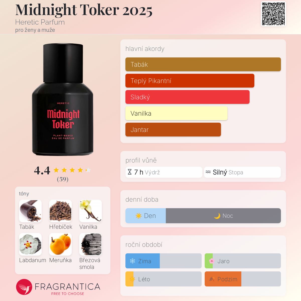 Midnight Toker 2025 podle Heretic Parfum je Aromatic Spicy vůně pro ženy a muže. Toto je nová vůně. Midnight Toker 2025 byl/a uveden/a v roce 2025. "Nosem" za touto vůní je Douglas Little. Vrchní tóny jsou Hřebíček a Cypriolový olej; střední tóny jsouMeruňka, Kořen orris a Jasmín ; základní tóny jsou Tabák, Vanilka, Labdanum a Březová smola.