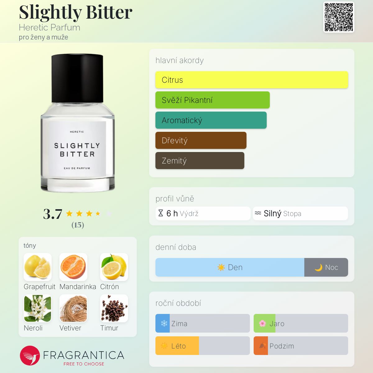 Slightly Bitter podle Heretic Parfum je Citrus vůně pro ženy a muže. Slightly Bitter byl/a uveden/a v roce 2020. "Nosem" za touto vůní je Douglas Little. Vrchní tóny jsou Grapefruit, Mandarinka a Citrón; střední tóny jsouNeroli a Citronový list ; základní tóny jsou Vetiver a Timur.