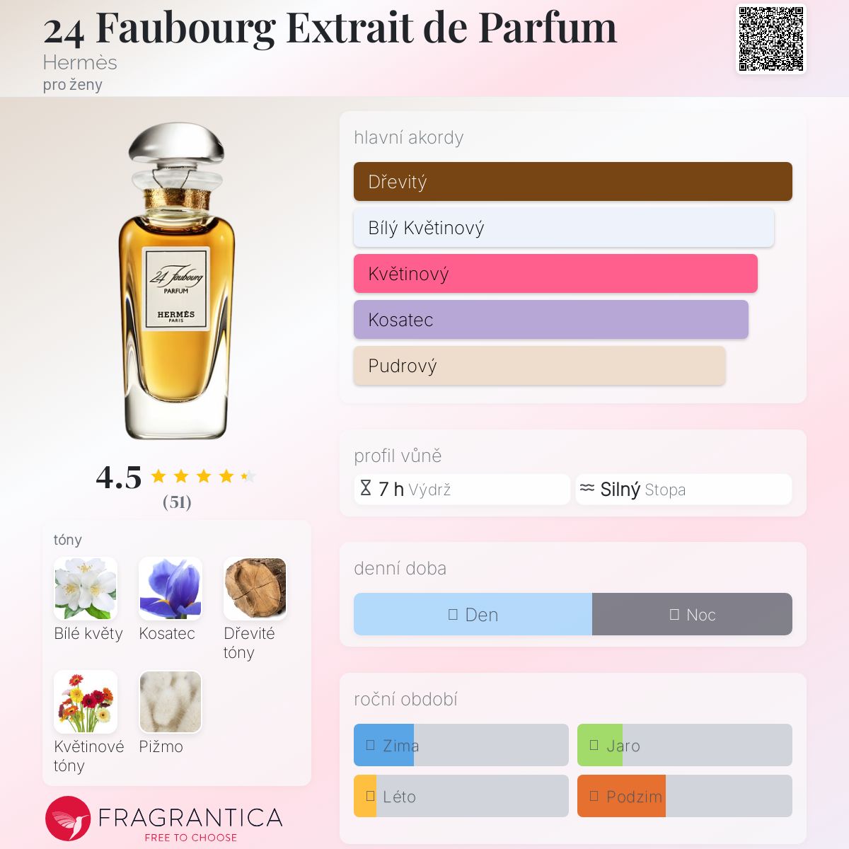 24 Faubourg Extrait de Parfum podle Hermès je Floral Woody Musk vůně pro ženy. 24 Faubourg Extrait de Parfum byl/a uveden/a v roce 1995. "Nosem" za touto vůní je Maurice Roucel.