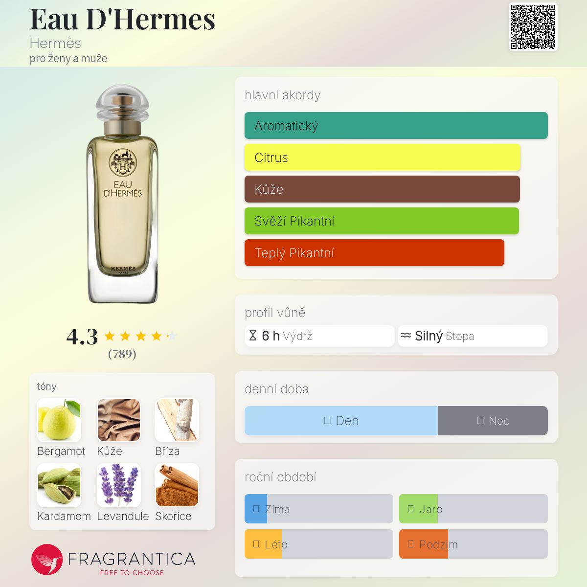 Eau D'Hermes podle Hermès je Leather vůně pro ženy a muže. Eau D'Hermes byl/a uveden/a v roce 1951. "Nosem" za touto vůní je Edmond Roudnitska. Vrchní tóny jsou Bergamot, Levandule, Citrón, Petitgrain a Šalvěj; střední tóny jsouKardamom, Skořice, Kmín, Bourbonské geránium , Jasmín, Koriandr a Hřebíček ; základní tóny jsou Kůže, Bříza, Santalové dřevo, Cedr, Mech, Fazole tonka, Vanilka a Labdanum.