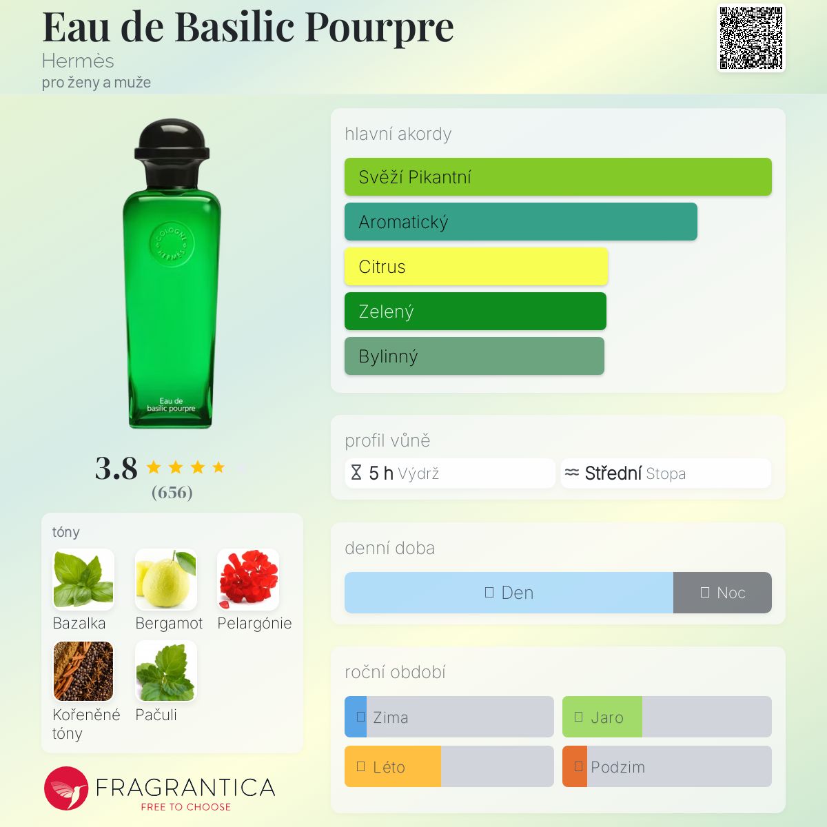 Eau de Basilic Pourpre podle Hermès je Woody Aromatic vůně pro ženy a muže. Eau de Basilic Pourpre byl/a uveden/a v roce 2022. "Nosem" za touto vůní je Christine Nagel. Vrchní tón je Bergamot ; střední tóny jsouBazalka a Pelargónie ; základní tóny jsou Koření a Pačuli.