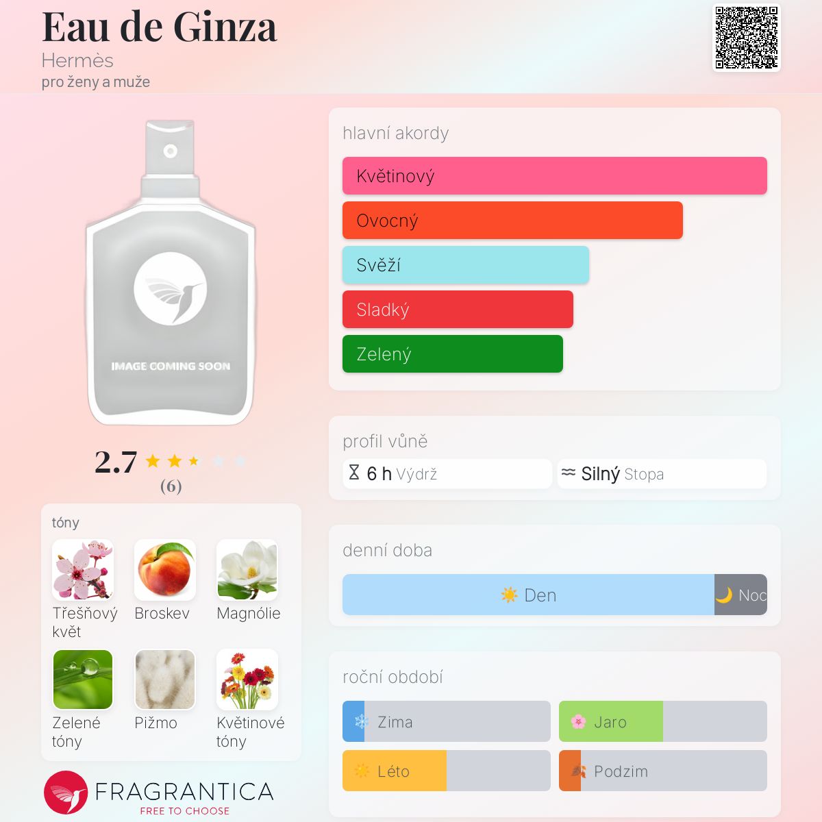 Eau de Ginza podle Hermès je Floral Fruity vůně pro ženy a muže. Eau de Ginza byl/a uveden/a v roce 2006. "Nosem" za touto vůní je Jean-Claude Ellena.