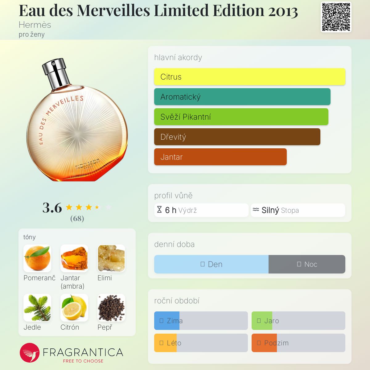 Eau des Merveilles Limited Edition 2013 podle Hermès je Orientální Woody vůně pro ženy. Eau des Merveilles Limited Edition 2013 byl/a uveden/a v roce 2013. Vrchní tóny jsou Pomeranč, Elimi a Citrón; střední tóny jsouJantar (ambra), Pepř, Růžový pepř a Fialka ; základní tóny jsou Jedle, Mech, Cedr a Vetiver.