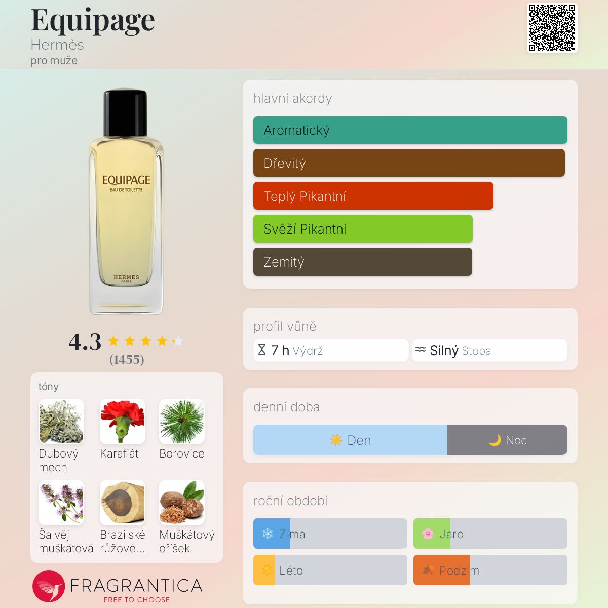 Equipage podle Hermès je Orientální Fougere vůně pro muže. Equipage byl/a uveden/a v roce 1970. "Nosem" za touto vůní je Guy Robert. Vrchní tóny jsou Šalvěj muškátová, Brazilské růžové dřevo, Muškátový květ, Bergamot, Aldehydy, Pomeranč, Estragon a Majoránka; střední tóny jsouKarafiát, Jehličí borovice, Skořice, Konvalinka, Jasmín, Yzop a Šuškarda ; základní tóny jsou Dubový mech, Vetiver, Pačuli, Fazole tonka, Pižmo, Vanilka a Jantar (ambra).