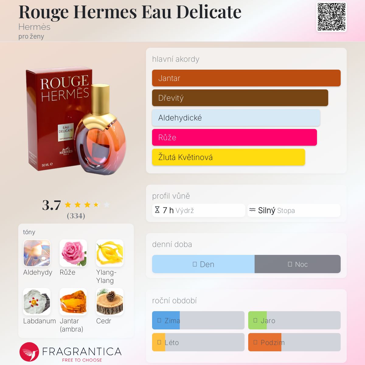 Rouge Hermes Eau Delicate podle Hermès je Floral Woody Musk vůně pro ženy. Rouge Hermes Eau Delicate byl/a uveden/a v roce 2002. "Nosem" za touto vůní je Akiko Kamei. Vrchní tóny jsou Aldehydy a Ylang-Ylang; střední tóny jsouRůže a Vanilka ; základní tóny jsou Labdanum, Jantar (ambra) a Cedr.