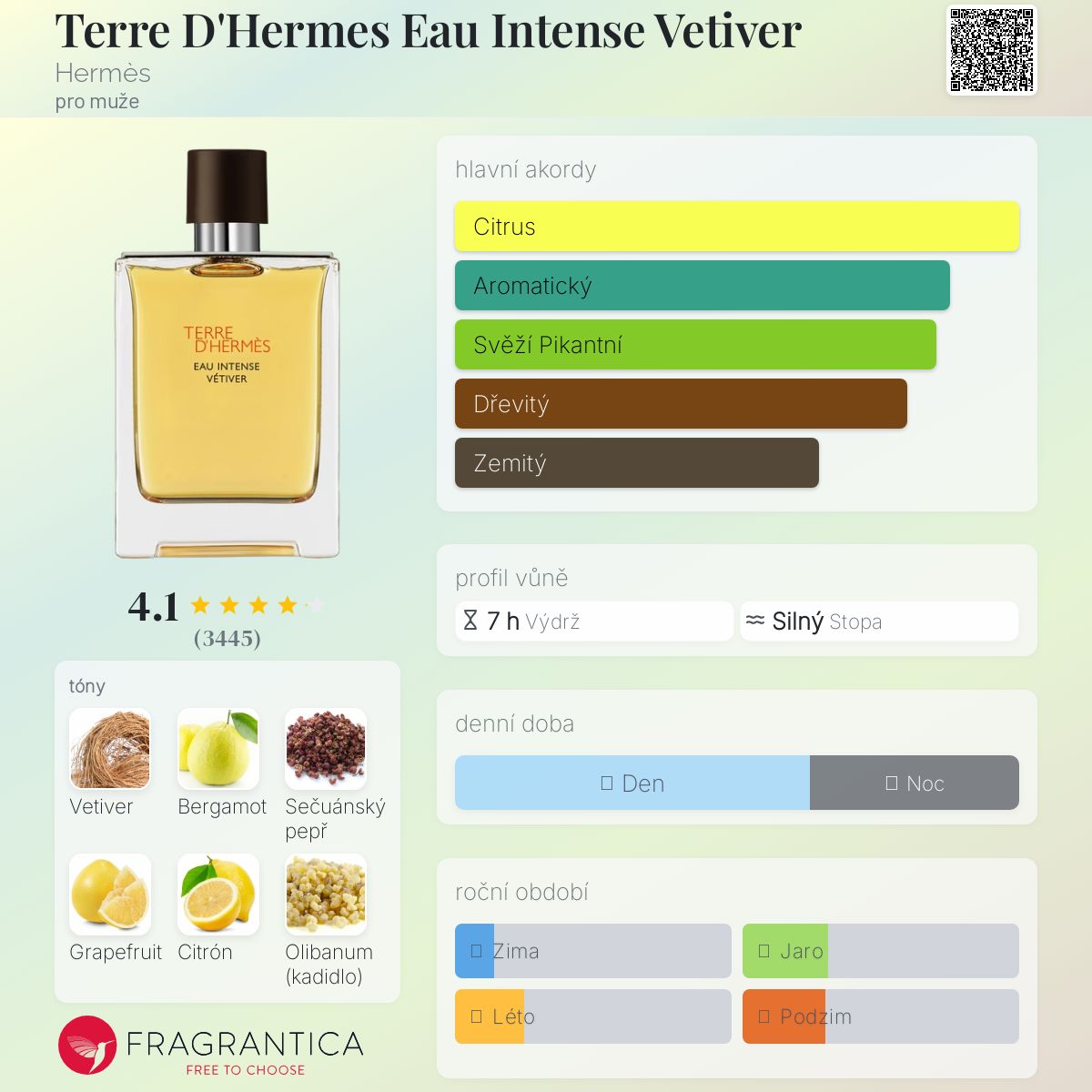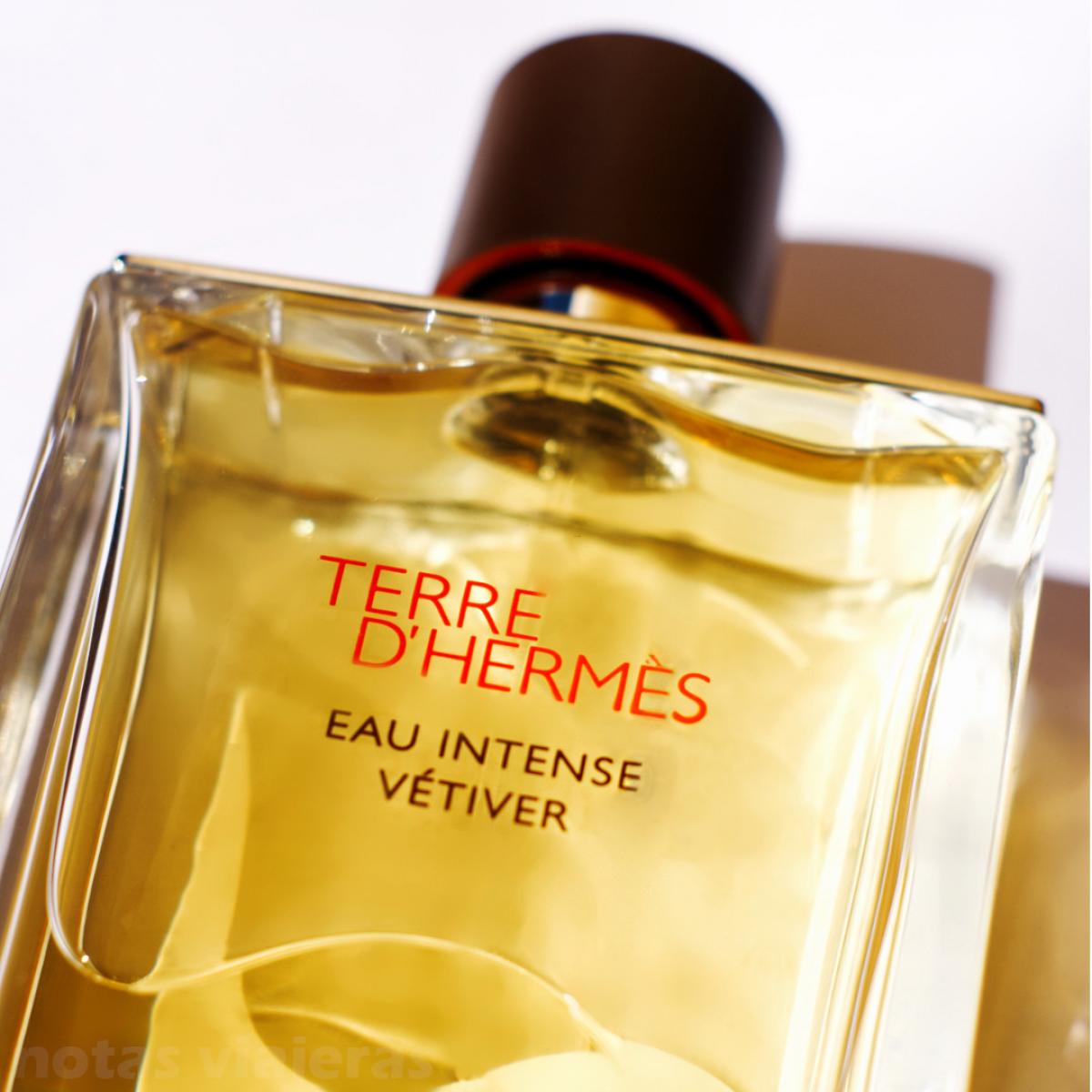 Terre D'Hermes Eau Intense Vetiver podle Hermès je Woody Aromatic vůně pro muže. Terre D'Hermes Eau Intense Vetiver byl/a uveden/a v roce 2018. "Nosem" za touto vůní je Christine Nagel. Vrchní tóny jsou Bergamot, Grapefruit a Citrón; střední tóny jsouSečuánský pepř a Pelargónie ; základní tóny jsou Vetiver, Olibanum, Pačuli a Jantarové dřevo.