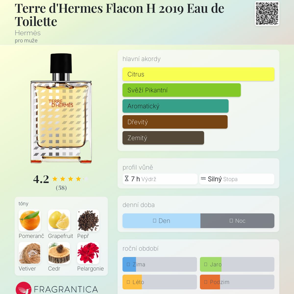 Terre d'Hermes Flacon H 2019 Eau de Toilette podle Hermès je Woody Spicy vůně pro muže. Terre d'Hermes Flacon H 2019 Eau de Toilette byl/a uveden/a v roce 2019. "Nosem" za touto vůní je Jean-Claude Ellena. Vrchní tóny jsou Pomeranč a Grapefruit; střední tóny jsouPepř a Pelargonie ; základní tóny jsou Vetiver, Cedr, Pačuli a Benzoin.
