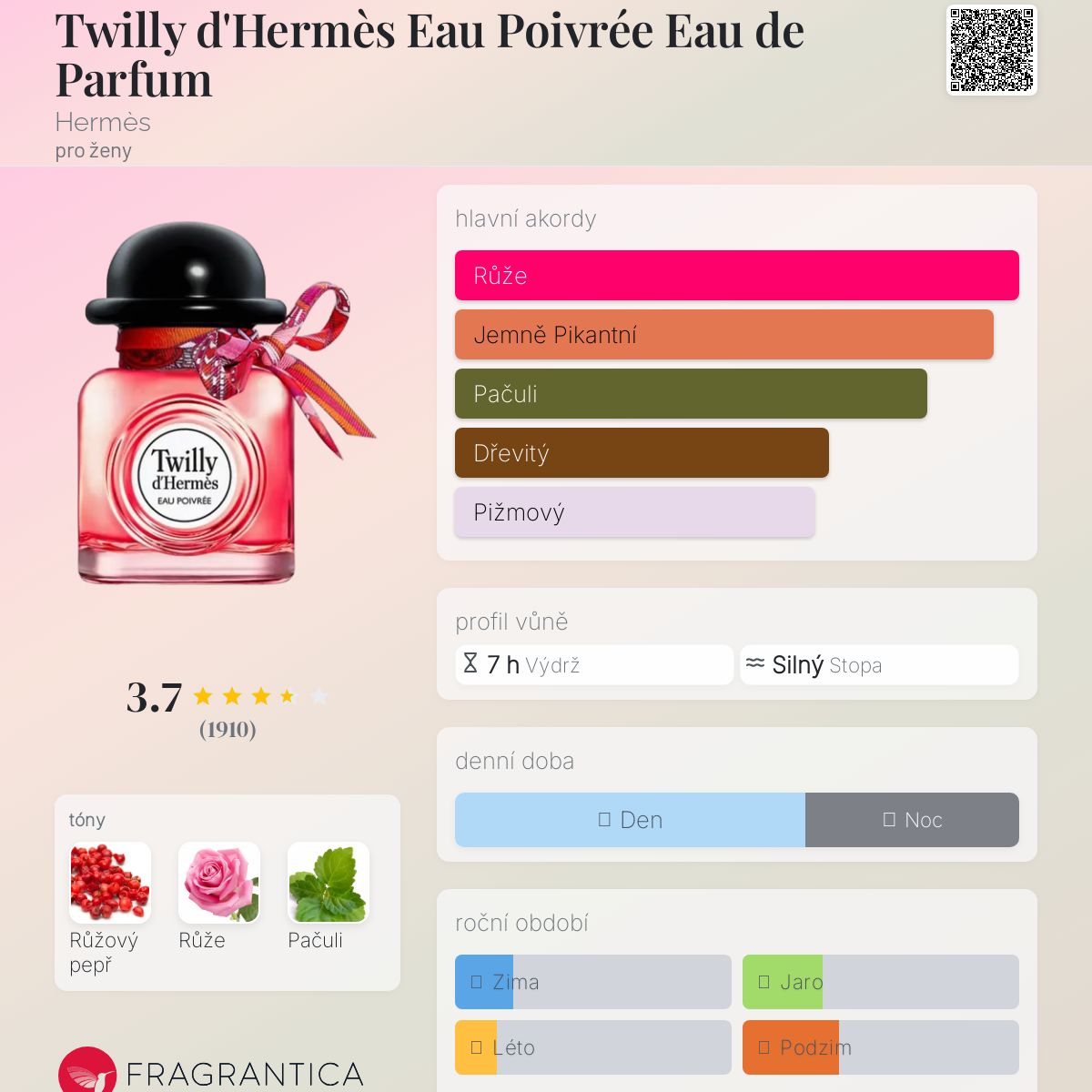 Twilly d'Hermès Eau Poivrée Eau de Parfum podle Hermès je Chypre Floral vůně pro ženy. Twilly d'Hermès Eau Poivrée Eau de Parfum byl/a uveden/a v roce 2019. "Nosem" za touto vůní je Christine Nagel. Vrchní tón je Růžový pepř ; střední tón jeRůže ; základní tón je Pačuli.