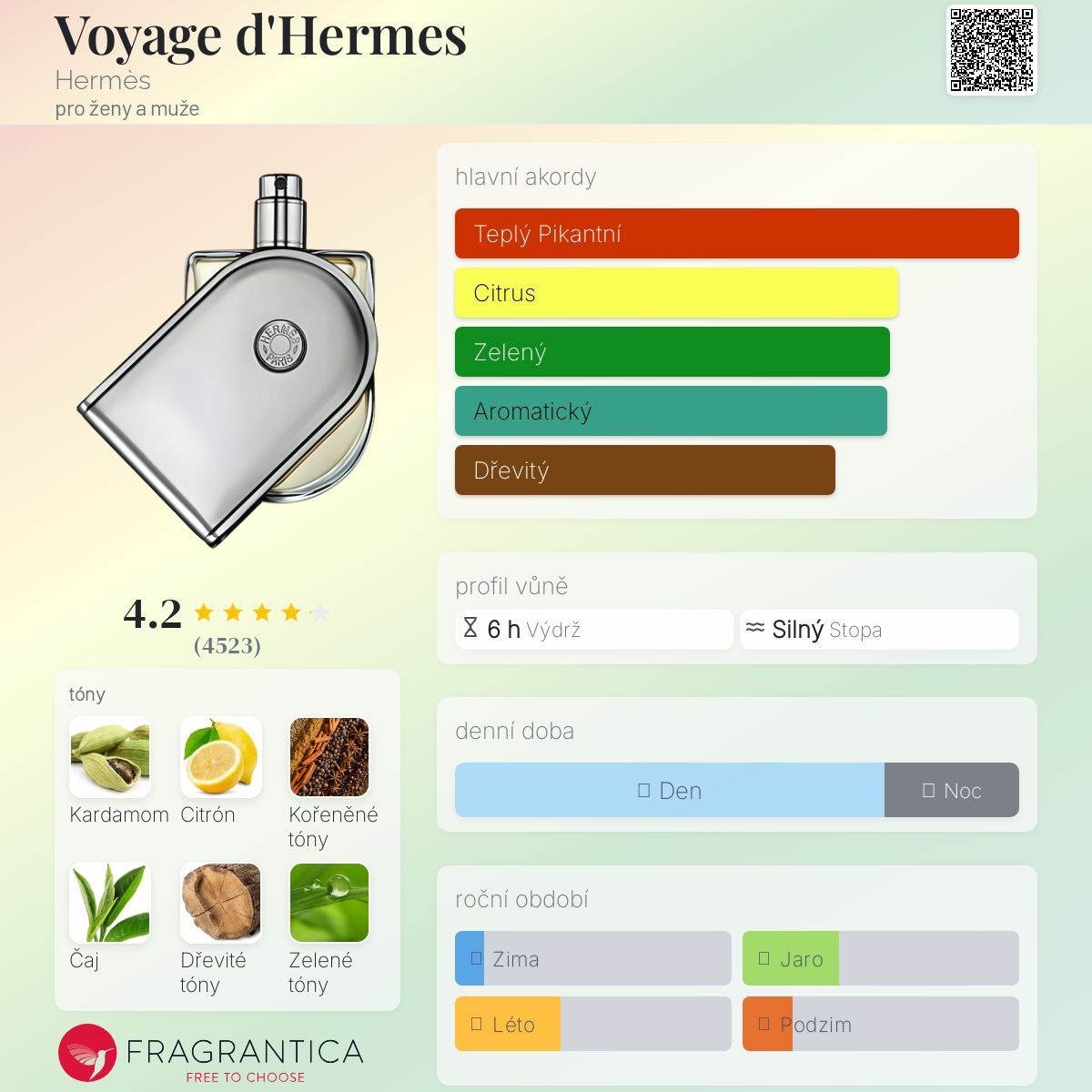 Krásně jiskřivý úvod díky citronu a koření působí téměř jako hravý parfém, dokud se neozve přísnost kardamomu (tón, který mi připomíná Declaration by Cartier) a čaje, která tlumí veškeré počáteční nadšení a činí tuto Voyage méně nenucenou. Na kůži zůstává dřevitou letní dámskou vůní, která mi přinejmenším hodně připomíná výše zmíněný Cartier (vydaný o 11 let dříve), který se mi těžko nosí a snáší. Tato je mnohem lehčí a pomíjivější, s trváním podobným kolínské, kterou je třeba hojně stříkat. Čekal jsem mnohem víc, zejména co se týče originality. 6+/10