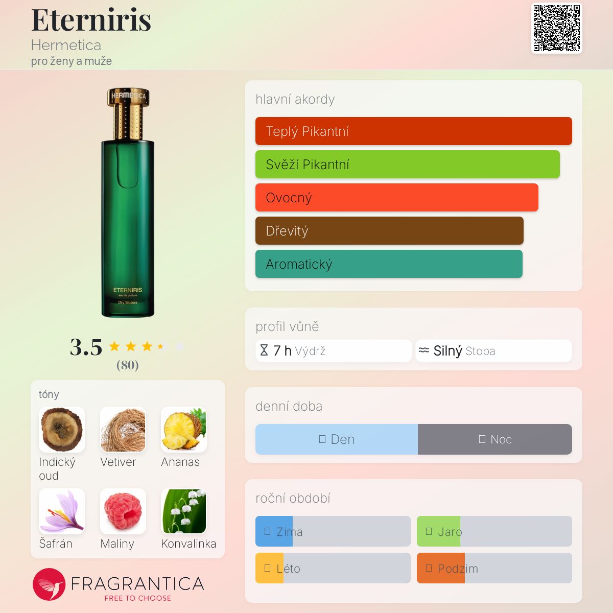 Eterniris podle Hermetica je Floral Fruity vůně pro ženy a muže. Eterniris byl/a uveden/a v roce 2020. Vrchní tóny jsou Ananas, Šafrán, Bulharská růže, Pepř, Mandarinka, Bergamot a Fialkový list; střední tóny jsouMaliny, Konvalinka, Pelargónie, Hřebíček, Orris, Cedr, Jasmín a Muškátový oříšek ; základní tóny jsou Indický oud, Vetiver, Pačuli, Jantar (ambra), Myrha, Vanilka, Pižmo a Fazole tonka.