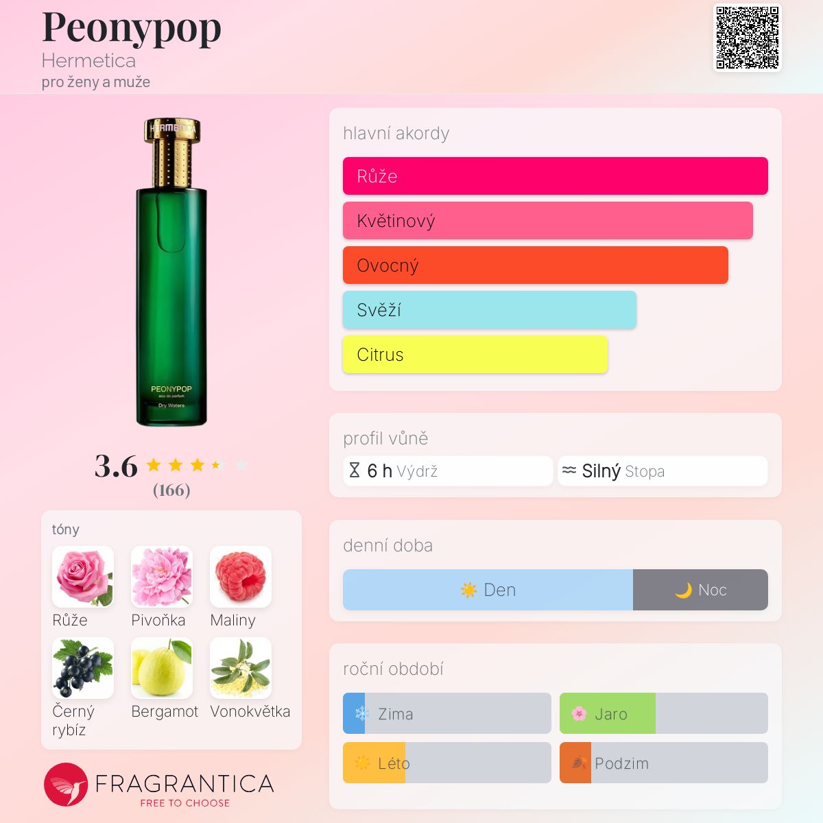 Peonypop podle Hermetica je Floral Fruity vůně pro ženy a muže. Peonypop byl/a uveden/a v roce 2021. Vrchní tóny jsou Bulharská růže, Černý rybíz, Bergamot, Vonokvětka, Grapefruit a Fialkový list; střední tóny jsouPivoňka, Maliny, Jasmín, Pelargónie, Konvalinka a Kosatec ; základní tóny jsou Pižmo, Vetiver, Švestka, Cedr, Jantar (ambra), Mech, Santalové dřevo a Myrha.