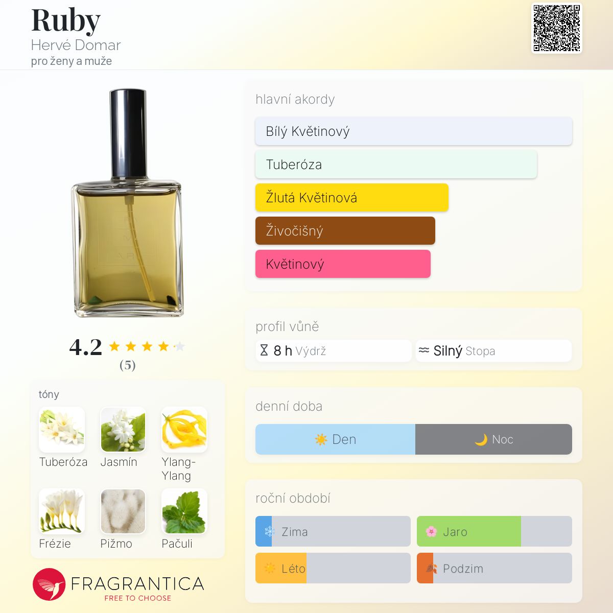 Ruby podle Hervé Domar je Floral vůně pro ženy a muže. Ruby byl/a uveden/a v roce 2009. Vrchní tóny jsou Frézie a Koriandr; střední tóny jsouTuberóza, Jasmín a Ylang-Ylang ; základní tóny jsou Pižmo, Pačuli a Otočník.