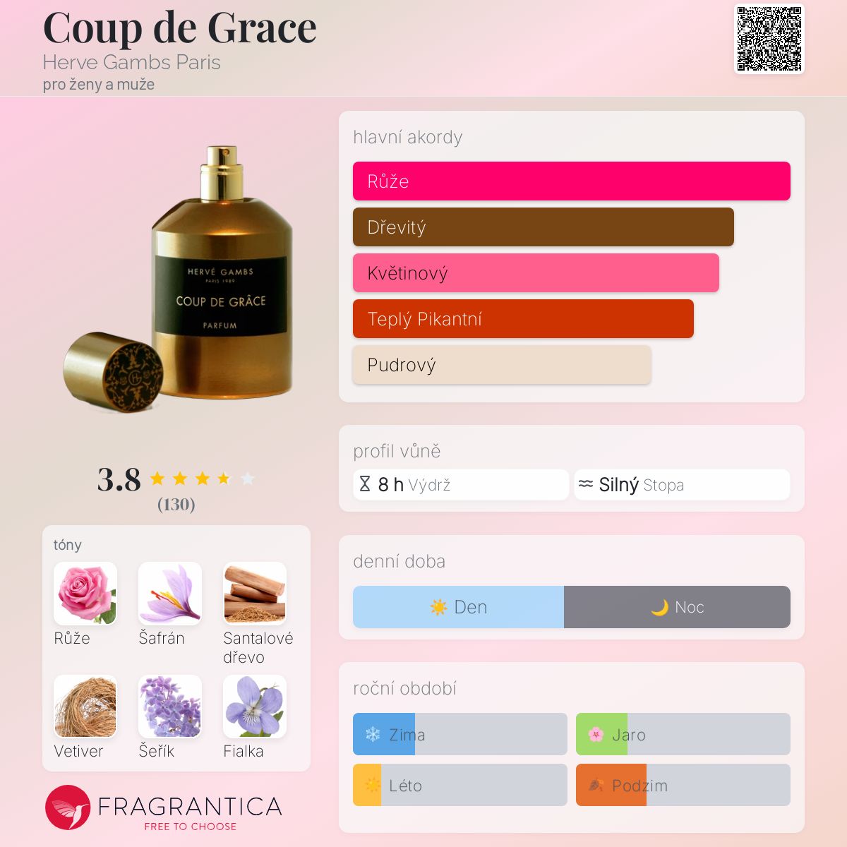 Coup de Grace podle Herve Gambs Paris je Orientální Floral vůně pro ženy a muže. Coup de Grace byl/a uveden/a v roce 2013. Vrchní tóny jsou Damašská růže, Šeřík a Fialka; střední tóny jsouŠafrán a Vetiver ; základní tóny jsou Santalové dřevo a Jantar (ambra).