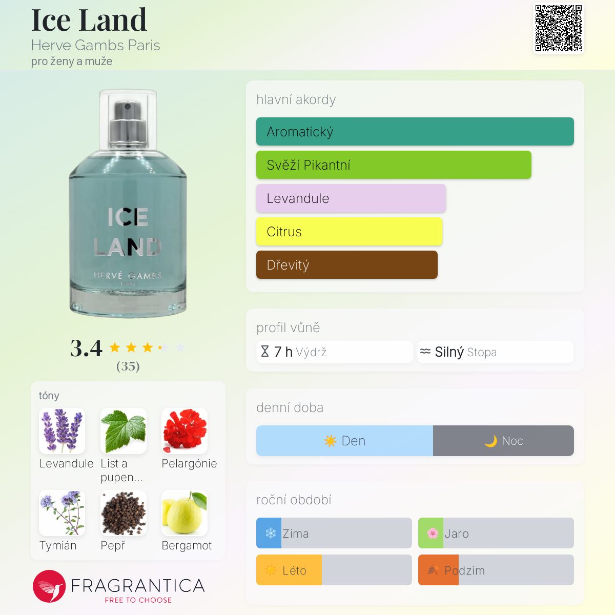Ice Land podle Herve Gambs Paris je Woody Aromatic vůně pro ženy a muže. Ice Land byl/a uveden/a v roce 2019. "Nosem" za touto vůní je Herve Gambs. Vrchní tóny jsou Levandule, Černý pepř, Bergamot a Mandarinka; střední tóny jsouČerný rybíz a Pelargónie ; základní tóny jsou Tymián, Mech, Vetiver a Pačuli.
