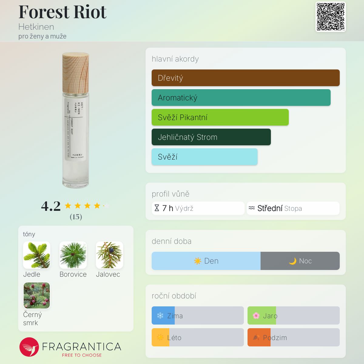 Forest Riot podle Hetkinen je vůně pro ženy a muže. Forest Riot byl/a uveden/a v roce 2020. Vrchní tón je Borovice ; střední tóny jsouJedle bělokorá a Jalovec ; základní tón je Černý smrk.