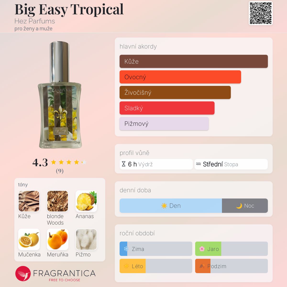 Big Easy Tropical podle Hez Parfums je Citrus Gourmand vůně pro ženy a muže. Big Easy Tropical byl/a uveden/a v roce 2023. "Nosem" za touto vůní je Hez Binkowitz. Vrchní tóny jsou Ananas, Mučenka a Meruňka; střední tóny jsouPomerančový květ a Kokos ; základní tóny jsou Kůže, Světlá dřeva a Pižmo.