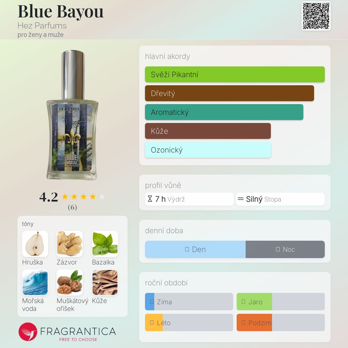 Blue Bayou podle Hez Parfums je Aromatic Aquatic vůně pro ženy a muže. Toto je nová vůně. Blue Bayou byl/a uveden/a v roce 2023. "Nosem" za touto vůní je Hez Binkowitz. Vrchní tóny jsou Hruška, Zázvor a Bazalka; střední tóny jsouMořské tóny, Muškátový oříšek, Kůže a Ozonové tóny ; základní tóny jsou Březule vonná, Čisté dřevo a Pižmo.