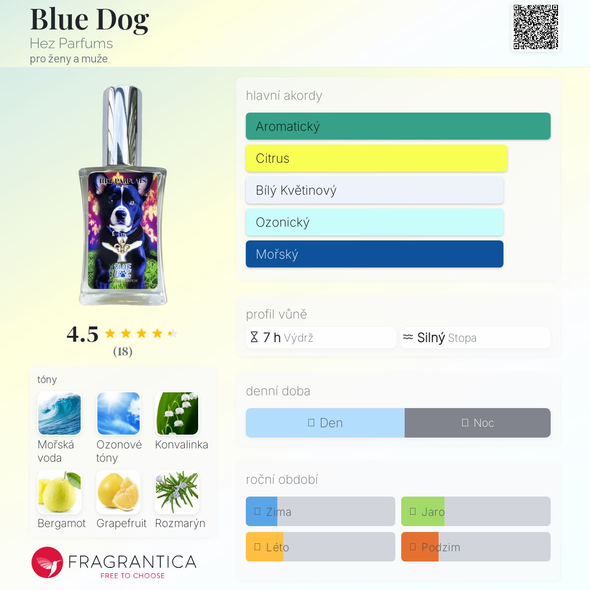 Blue Dog podle Hez Parfums je vůně pro ženy a muže. Blue Dog byl/a uveden/a v roce 2023. "Nosem" za touto vůní je Hez Binkowitz. Vrchní tóny jsou Bergamot, Grapefruit, Rozmarýn, Růžový pepř a Zázvor; střední tóny jsouMořské tóny, Ozonové tóny, Konvalinka, Levandule, Kardamom a Fazole tonka ; základní tóny jsou Santalové dřevo, Vetiver, Pačuli, Ambroxan, Pižmo a Kadidlo.